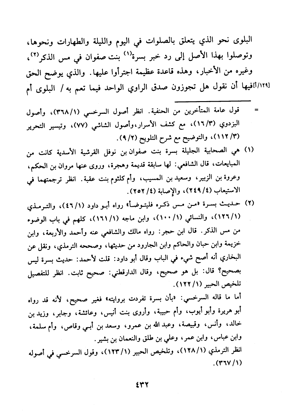 الْبلوى نَحْو الَّذِي يتَعَلَّق بالصلوات فِي الْيَوْم وَاللَّيْلَة والطهارات وَنَحْوهَا، وتوصلوا بِهَذَا الأَصْل إِلَى رد خبر بسرة بنت صَفْوَان فِي مس الذّكر، وَغَيره من الْأَخْبَار، وَهَذِه قَاعِدَة عَظِيمَة أجترأوا عَلَيْهَا. وَالَّذِي يُوضح الْحق فِيهَا أَن نقُول هَل تجوزون صدق الرَّاوِي الْوَاحِد فِيمَا تعم بِهِ / الْبلوى أم