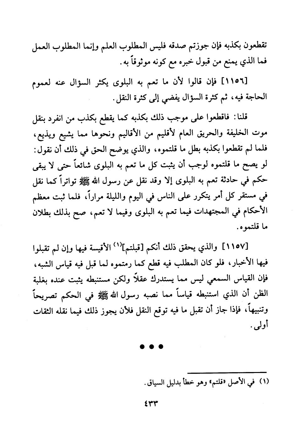 قُلْنَا: فافطعوا على مُوجب ذَلِك بكذبه كَمَا يقطع بكذب من انْفَرد بِنَقْل موت الْخَلِيفَة والحريق الْعَام لأقليم من الأقاليم وَنَحْوهَا مِمَّا يشيع ويذيع، فَلَمَّا لم تقطعوا بكذبه بَطل مَا قلتموه، وَالَّذِي يُوضح الْحق فِي ذَلِك ان نقُول: لَو يَصح مَا قلتموه لوَجَبَ أَن يثبت كل مَا تعم بِهِ الْبلوى شَائِعا حَتَّى لَا يبْقى حكم فِي حَادِثَة تعم بِهِ الْبلوى إِلَّا وَقد نقل عَن رَسُول الله صلى الله عَلَيْهِ وَسلم تواترا كَمَا نقل فِي مُسْتَقر كل أَمر يتَكَرَّر على النَّاس فِي الْيَوْم وَاللَّيْلَة مرَارًا، فَلَمَّا ثَبت مُعظم الْأَحْكَام فِي المجتهدات فِيمَا تعم بِهِ الْبلوى وَفِيمَا لَا تعم، صَحَّ بذلك بطلَان مَا قلتموه.