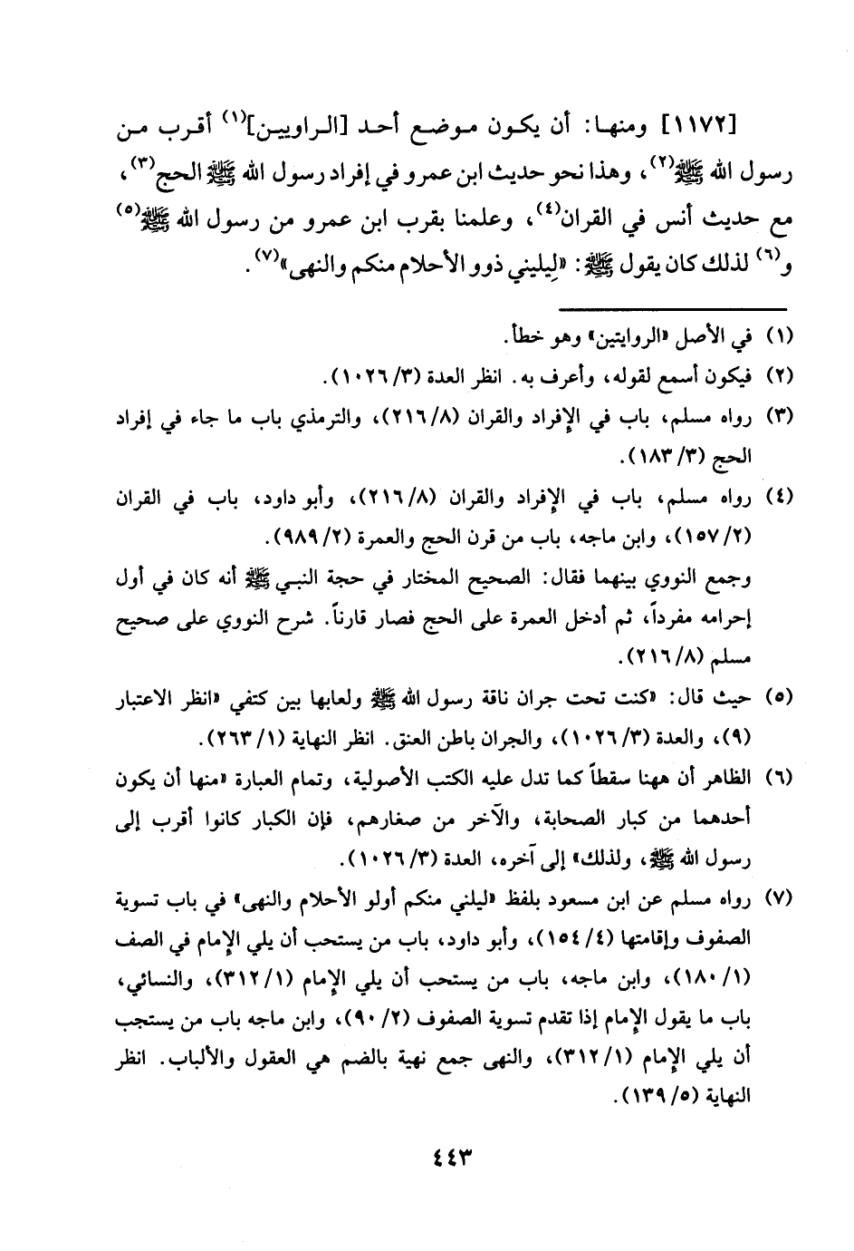 [1172] وَمِنْهَا: أَن يكون مَوضِع أحد [الروايين] أقرب من رَسُول الله صلى الله عَلَيْهِ وَسلم، وَهَذَا نَحْو حَدِيث ابْن عَمْرو فِي إِفْرَاد رَسُول الله صلى الله عَلَيْهِ وَسلم الْحَج، مَعَ حَدِيث أنس فِي الْقرَان، وَعلمنَا بِقرب ابْن عَمْرو من رَسُول الله صلى الله عَلَيْهِ وَسلم وَلذَلِك كَانَ يَقُول صلى الله عَلَيْهِ وَسلم: " ليليني ذَوُو الأحلام مِنْكُم والنهى ".