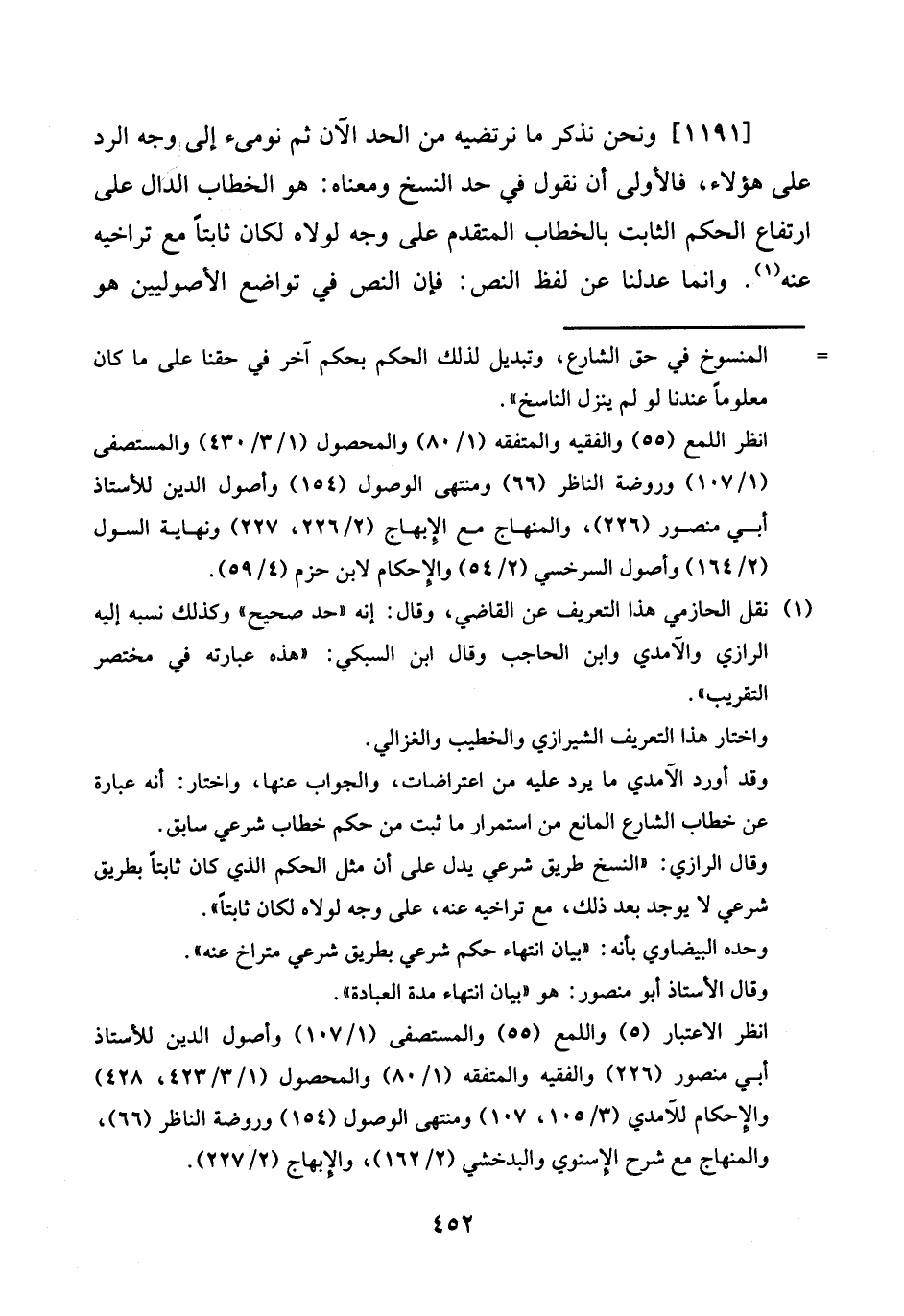 [1191] وَنحن نذْكر ر مَا نرتضيه من الْحَد الْآن ثمَّ نومىء إِلَى وَجه الرَّد على هَؤُلَاءِ، فَالْأولى أَن نقُول فِي حد النّسخ وَمَعْنَاهُ: هُوَ الْخطاب الدَّال على ارْتِفَاع الحكم الثَّابِت بِالْخِطَابِ الْمُتَقَدّم على وَجه لولاه لَكَانَ ثَابتا مَعَ تراخيه عَنهُ. وَإِنَّمَا عدلنا عَن لفظ النَّص: فَإِن النَّص فِي تواضع الْأُصُولِيِّينَ هُوَ