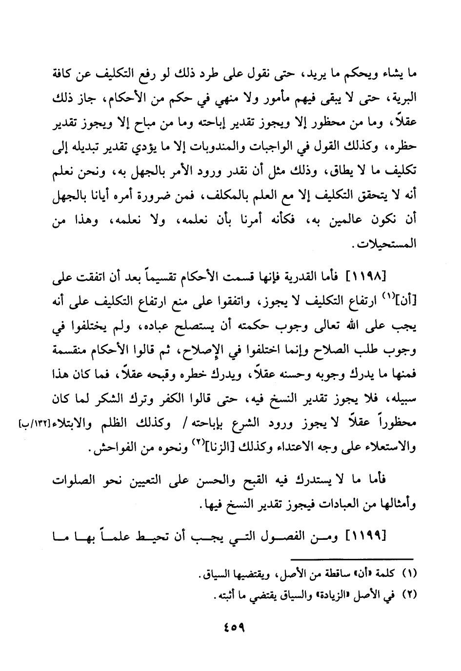 [1198] فَأَما الْقَدَرِيَّة فَإِنَّهَا قسمت الْأَحْكَام تقسيما بعد أَن اتّفقت على [أَن] ارْتِفَاع التَّكْلِيف لَا يجوز، وَاتَّفَقُوا على منع ارْتِفَاع التَّكْلِيف على أَنه يجب على الله تَعَالَى وجوب حكمته أَن يستصلح عباده، وَلم يَخْتَلِفُوا فِي وجوب طلب الصّلاح وَإِنَّمَا اخْتلفُوا فِي الْإِصْلَاح، ثمَّ قَالُوا الْأَحْكَام منقسمة فَمِنْهَا مَا يدْرك وُجُوبه وَحسنه عقلا، وَيدْرك خطره وقبحه عقلا، فَمَا كَانَ هَذَا سَبيله، فَلَا يجوز تَقْدِير النّسخ فِيهِ، حَتَّى قَالُوا الْكفْر وَترك الشُّكْر لما كَانَ مَحْظُورًا عقلا لَا يجوز وُرُود الشَّرْع بإباحته / وَكَذَلِكَ الظُّلم والابتلاء [132 / ب] والاستعلاء على وَجه الاعتداء وَكَذَلِكَ [الزِّنَا] وَنَحْوه من الْفَوَاحِش.