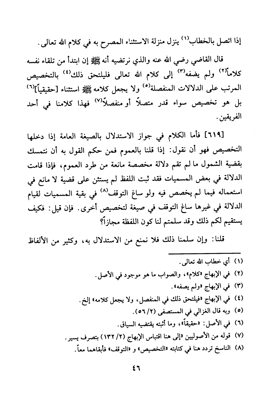 قَالَ القَاضِي رَضِي الله عَنهُ وَالَّذِي نرتضيه انه صلى الله عَلَيْهِ وَسلم إِن ابْتَدَأَ من تِلْقَاء نَفسه كلَاما وَلم يضفه إِلَى كَلَام الله تَعَالَى فليلتحق ذَلِك بالتخصيص الْمُرَتّب على الدلالات الْمُنْفَصِلَة وَلَا يَجْعَل كَلَامه صلى الله عَلَيْهِ وَسلم اسْتثِْنَاء [حَقِيقِيًّا] بل هُوَ تَخْصِيص سَوَاء قدر مُتَّصِلا أَو مُنْفَصِلا فَهَذَا كلامنا فِي اُحْدُ الْفَرِيقَيْنِ. [619] فَأَما الْكَلَام فِي جَوَاز الِاسْتِدْلَال بالصيغة الْعَامَّة إِذا دَخلهَا التَّخْصِيص فَهُوَ أَن نقُول: إِذا قُلْنَا بِالْعُمُومِ فَمن حكم القَوْل بِهِ أَن نتمسك بقضية الشُّمُول مَا لم تقم دلَالَة مخصصة مَانِعَة من طردا لعُمُوم، فَإِذا قَامَت الدّلَالَة فِي بعض المسميات فقد ثَبت اللَّفْظ لم يسْتَثْن على قَضِيَّة لَا مَانع فِي اسْتِعْمَاله فِيمَا لم يخصص فِيهِ وَلَو سَاغَ التَّوَقُّف فِي بَقِيَّة المسميات لقِيَام الدّلَالَة فِي غَيرهَا سَاغَ التَّوَقُّف فِي صِيغَة لتخصيص أُخْرَى. فَإِن قيل: فَكيف يَسْتَقِيم لكم ذَلِك وَقد سلمتم لنا كَون اللَّفْظَة مجَازًا؟