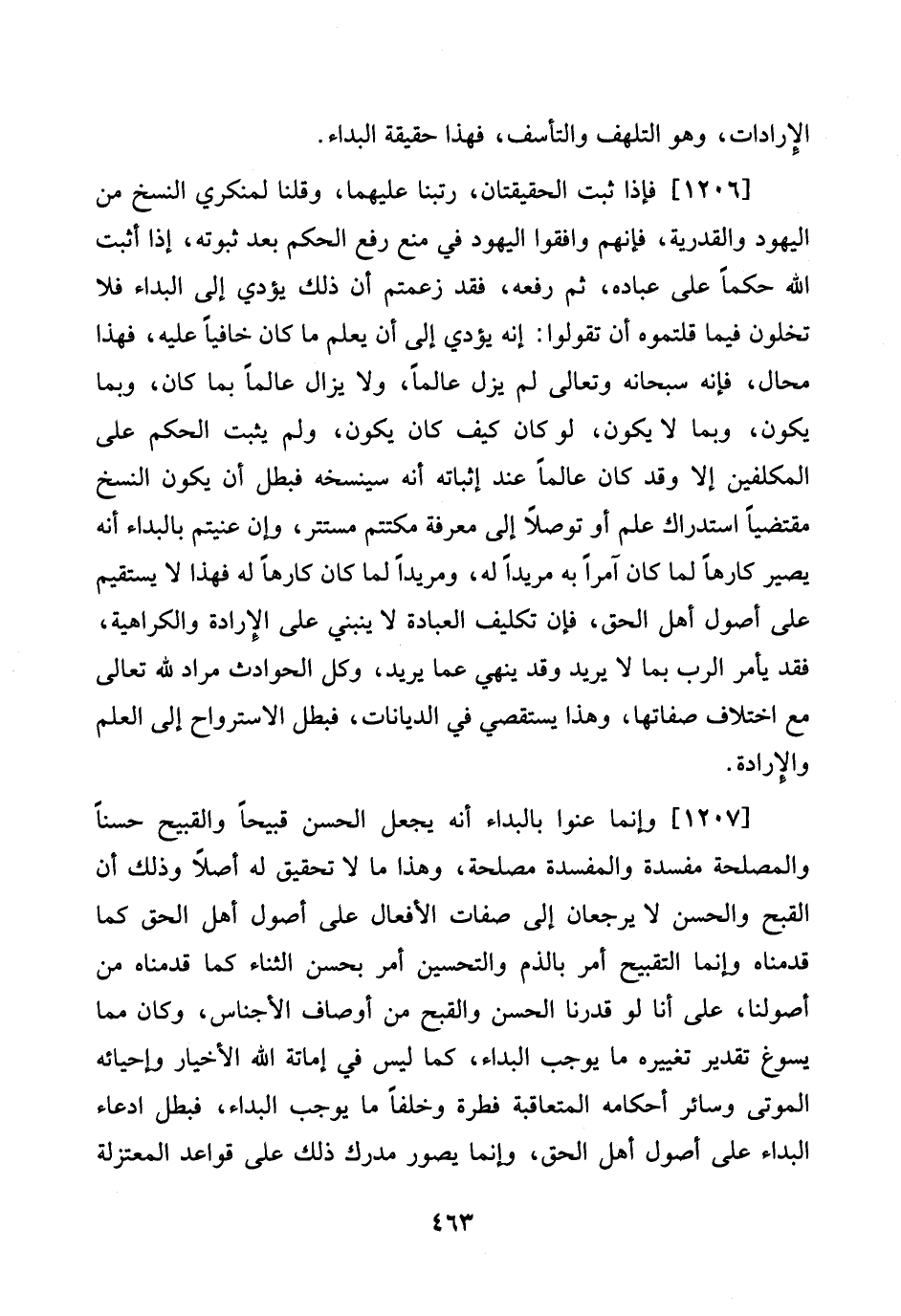 [1206] فَإِذا ثَبت الحقيقتان، رتبنا عَلَيْهِمَا، وَقُلْنَا لمنكري النّسخ من الْيَهُود والقدرية، فَإِنَّهُم وافقوا الْيَهُود فِي منع رفع الحكم بعد ثُبُوته، إِذا أثبت الله حكما على عباده، ثمَّ رَفعه، فقد زعمتم أَن ذَلِك يُؤَدِّي إِلَى البداء فَلَا تخلون فِيمَا قلتموه أَن تَقولُوا: إِنَّه يُؤَدِّي إِلَى أَن يعلم مَا كَانَ خافيا عَلَيْهِ، فَهَذَا محَال، فَإِنَّهُ سُبْحَانَهُ وَتَعَالَى لم يزل عَالما، وَلَا يزَال عَالما بِمَا كَانَ، وَبِمَا يكون، وَبِمَا لَا يكون، لوكان كَيفَ كَانَ يكون، وَلم يثبت الحكم على الْمُكَلّفين إِلَّا وَقد كَانَ عَالما عِنْد إثْبَاته أَنه سينسخه فَبَطل أَن يكون النّسخ مقتضيا اسْتِدْرَاك علم أَو توصلا إِلَى معرفَة مكتتم مستتر، وَإِن عنيتم بالبداء أَنه يصير كَارِهًا لما كَانَ آمرا بِهِ مرِيدا لَهُ، ومريدا لما كَانَ كَارِهًا لَهُ فَهَذَا لَا يَسْتَقِيم على أصُول أهل الْحق، فَإِن تَكْلِيف الْعِبَادَة لَا يَنْبَنِي على الْإِرَادَة والكراهية، فقد يَأْمر الرب بِمَا لَا يُرِيد وَقد يُنْهِي عَمَّا يُرِيد، وكل الْحَوَادِث مُرَاد لله تَعَالَى مَعَ اخْتِلَاف صفاتها، وَهَذَا يستقصي فِي الديانَات، فَبَطل الاسترواح إِلَى الْعلم والإرادة.