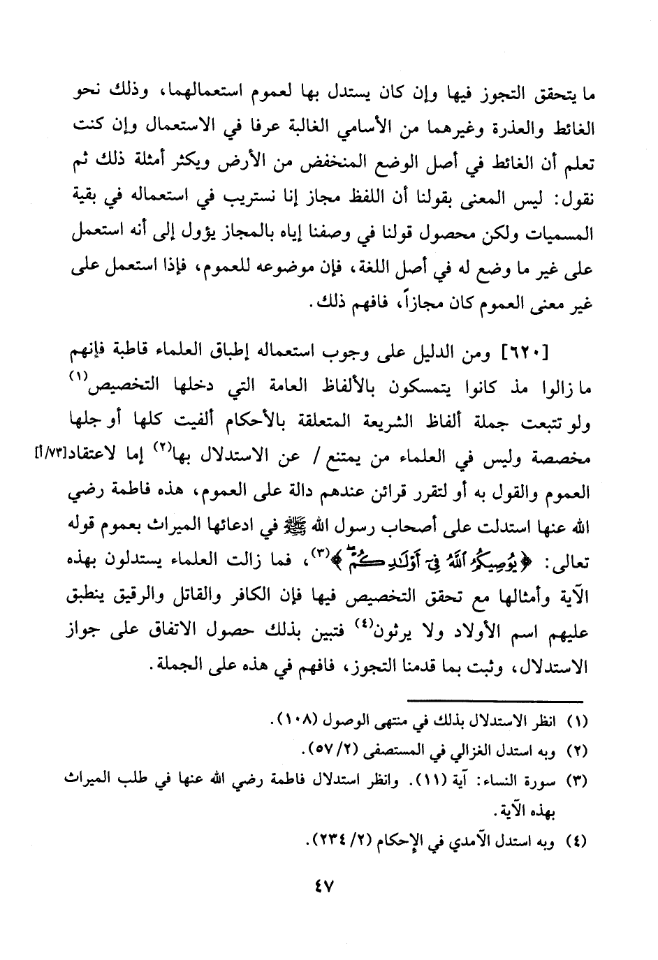 [620] وَمن الدَّلِيل على وجوب اسْتِعْمَاله إطباق الْعلمَاء قاطبة فَإِنَّهُم مَا زَالُوا مذ كَانُوا يتمسكون بالألفاظ الْعَامَّة الَّتِي دَخلهَا التَّخْصِيص وَلَو تتبعت جملَة أَلْفَاظ الشَّرِيعَة الْمُتَعَلّقَة بِالْأَحْكَامِ ألفيت كلهَا أَو جلها مخصصة وَلَيْسَ فِي الْعلمَاء من يمْتَنع / عَن الِاسْتِدْلَال بهَا إِمَّا لاعتقاد [73 / أ] الْعُمُوم وَالْقَوْل بِهِ أَو لتقرر قَرَائِن عِنْدهم دَالَّة على الْعُمُوم، هَذِه فَاطِمَة رَضِي الله عَنْهَا استدلت على أَصْحَاب رَسُول الله صلى الله عَلَيْهِ وَسلم فِي ادعائها الْمِيرَاث بِعُمُوم قَوْله تَعَالَى: {يُوصِيكُم الله فِي اولدكم} ، فَمَا زَالَت الْعلمَاء يستدلون بِهَذِهِ الْآيَة وأمثالها مَعَ تحقق التَّخْصِيص فِيهَا فَإِن الْكَافِر وَالْقَاتِل وَالرَّقِيق ينطبق عَلَيْهِم اسْم الْأَوْلَاد وَلَا يَرِثُونَ فَتبين بذلك حُصُول الِاتِّفَاق على جَوَاز الِاسْتِدْلَال، وَثَبت بِمَا قدمنَا التَّجَوُّز، فَافْهَم فِي هَذِه على الْجُمْلَة.