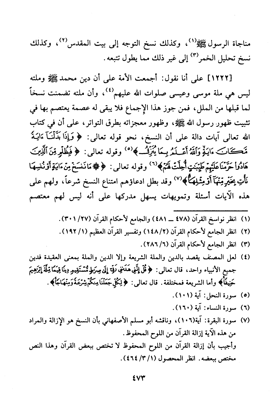 [1222] على أَنا نقُول: أَجمعت الْأمة على أَن دين مُحَمَّد صلى الله عَلَيْهِ وَسلم وملته لَيْسَ هِيَ مِلَّة مُوسَى وَعِيسَى صلوَات الله عَلَيْهِم، وَأَن مِلَّته تَضَمَّنت نسخا لما قبلهَا من الْملَل، فَمن جوز هَذَا الْإِجْمَاع فَلَا يبْقى لَهُ عصمَة يعتصم بهَا فِي تثبيت ظُهُور رَسُول الله صلى الله عَلَيْهِ وَسلم، وَظُهُور معجزاته بطرق التَّوَاتُر، على أَن فِي كتاب الله تَعَالَى آيَات دَالَّة على أَن النّسخ، نَحْو قَوْله تَعَالَى: {وَإِذا بدلنا آيَة مَكَان آيَة وَالله أعلم بِمَا ينزل} وَقَوله تَعَالَى: {فبظلم من الَّذين هادوا حرمنا عَلَيْهِم طَيّبَات أحلّت لَهُم} وَقَوله تَعَالَى: {مَا ننسخ من آيَة أَو ننسها نأت بِخَير مِنْهَا أومثلها} وَقد بَطل ادعاؤهم امْتنَاع النّسخ شرعا، وَلَهُم على هَذِه الْآيَات أسئلة وتمويهات يسهل مدركها على انه لَيْسَ لَهُم معتصم