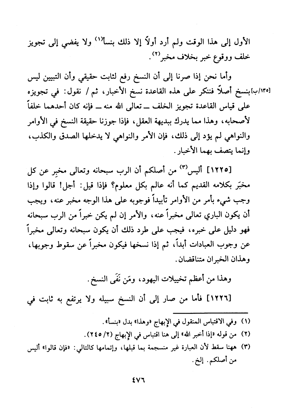 [1225] أَلَيْسَ من أصلكم أَن الرب سُبْحَانَهُ وَتَعَالَى مخبر عَن كل مخبر بِكَلَامِهِ الْقَدِيم كَمَا أَنه عَالم بِكُل مَعْلُوم؟ فَإِذا قيل: أجل! قَالُوا وَإِذا وَجب شَيْء بِأَمْر من الْأَوَامِر تأبيدا فوجوبه على هَذَا الْوَجْه مخبر عَنهُ، وَيجب أَن يكون الْبَارِي تَعَالَى مخبرا عَنهُ، وَالْأَمر إِن لم يكن خَبرا من الرب سُبْحَانَهُ فَهُوَ دَلِيل على خَبره، فَيجب على طرد ذَلِك أَن يكون سُبْحَانَهُ وَتَعَالَى مخبرا عَن وجوب الْعِبَادَات أبدا ثمَّ إِذا نسخهَا فَيكون مخبرا عَن سُقُوط وُجُوبهَا، وَهَذَانِ الخبران متناقضان.