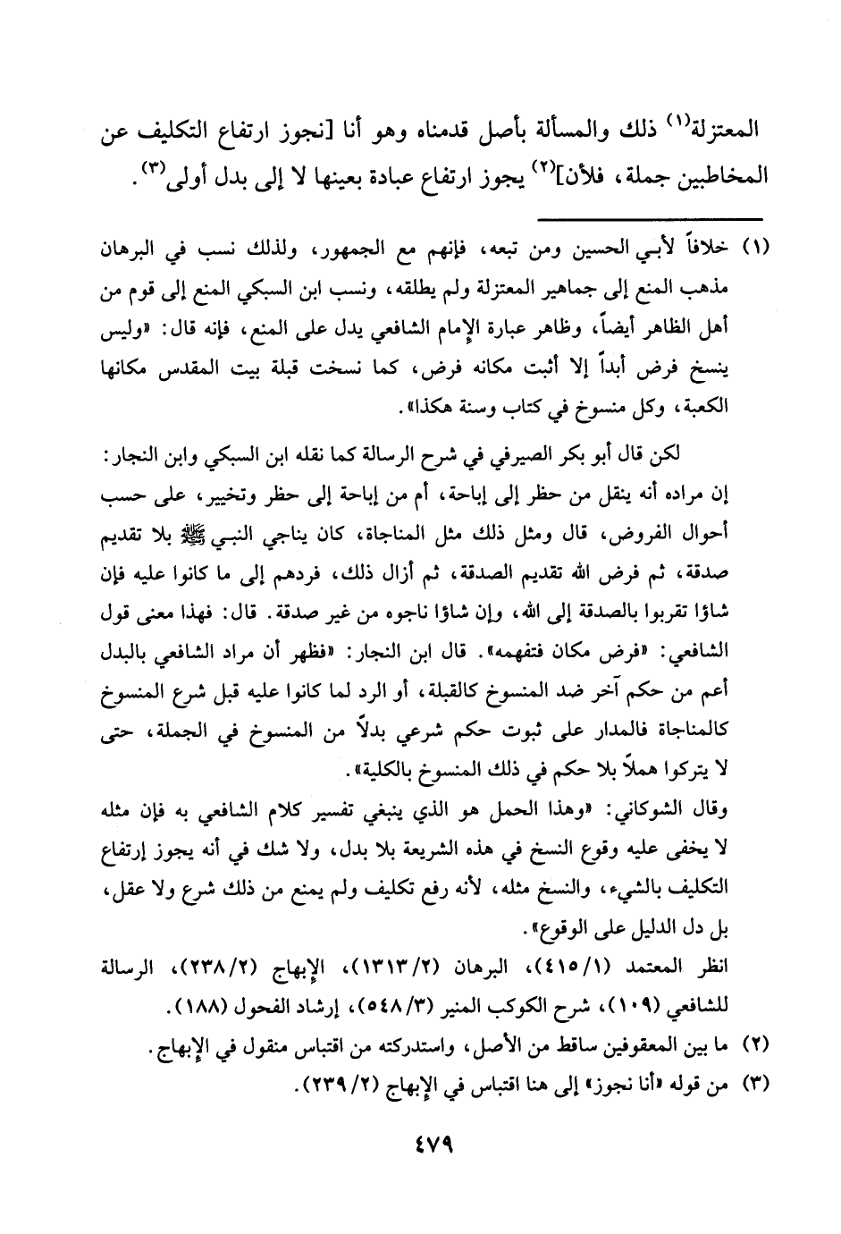 الْمُعْتَزلَة ذَلِك وَالْمَسْأَلَة بِأَصْل قدمْنَاهُ وَهُوَ أَنا [نجوز ارْتِفَاع التَّكْلِيف عَن المخاطبين جملَة، فَلِأَن] يجوز ارْتِفَاع عبَادَة بِعَينهَا لَا إِلَى بدل أولى.
