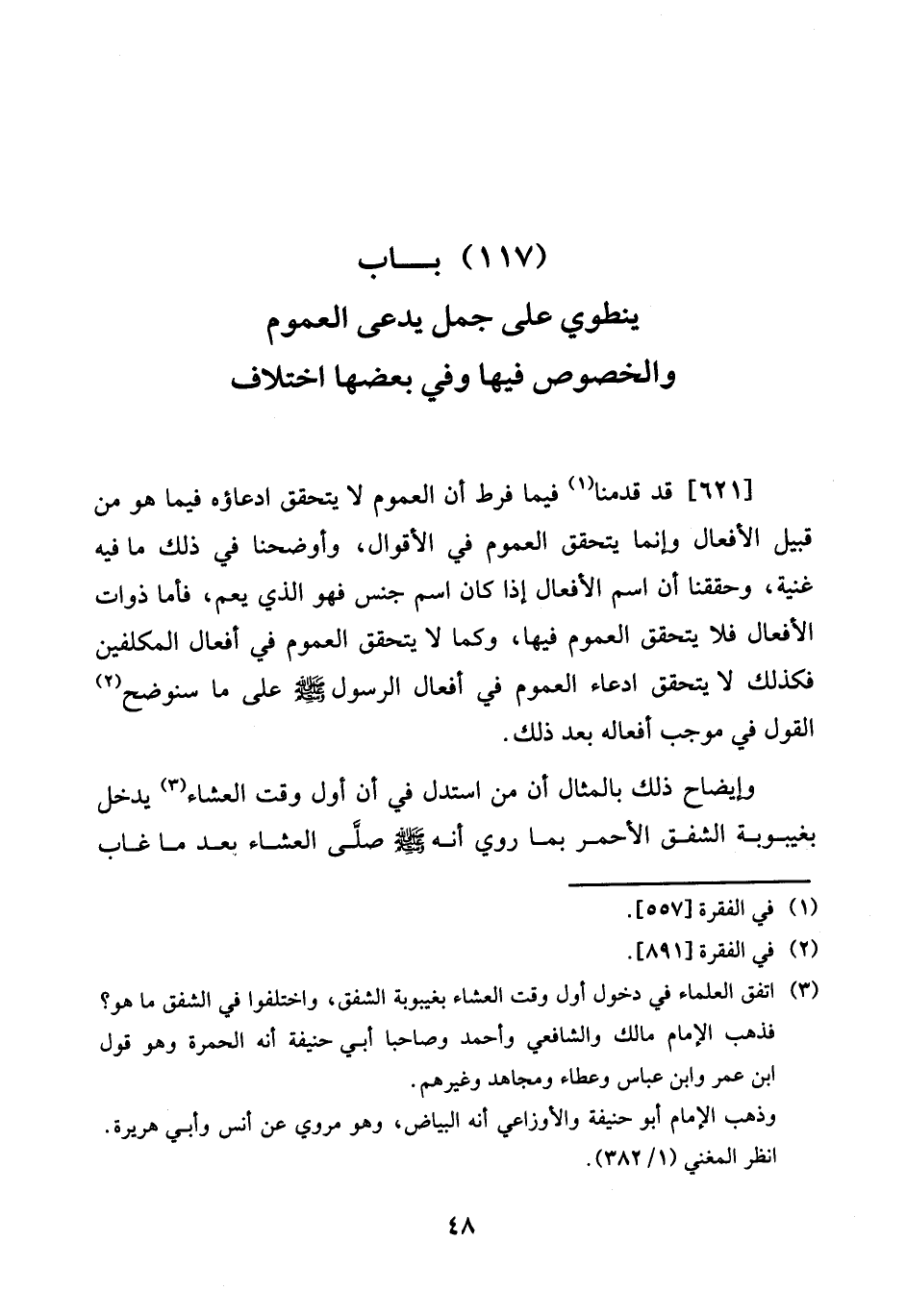 [621] قد قدمنَا فِيمَا فرط أَن العمموم لَا يتَحَقَّق ادعاؤه فِيمَا هُوَ من قبيل الْأَفْعَال وَإِنَّمَا يتَحَقَّق الْعُمُوم فِي الْأَقْوَال، وأوضحنا فِي ذَلِك مَا فِيهِ غنية، وحققنا أَن اسْم الْأَفْعَال إِذا كَانَ اسْم جنس فَهُوَ الَّذِي يعم، فَأَما ذَوَات الْأَفْعَال فَلَا يتَحَقَّق الْعُمُوم فِيهَا، وكما لَا يتَحَقَّق الْعُمُوم فِي افعال الْمُكَلّفين فَكَذَلِك لَا يتَحَقَّق ادِّعَاء الْعُمُوم فِي أَفعَال الرَّسُول صلى الله عَلَيْهِ وَسلم على مَا سنوضح القَوْل فِي مُوجب أَفعاله بعد ذَلِك.