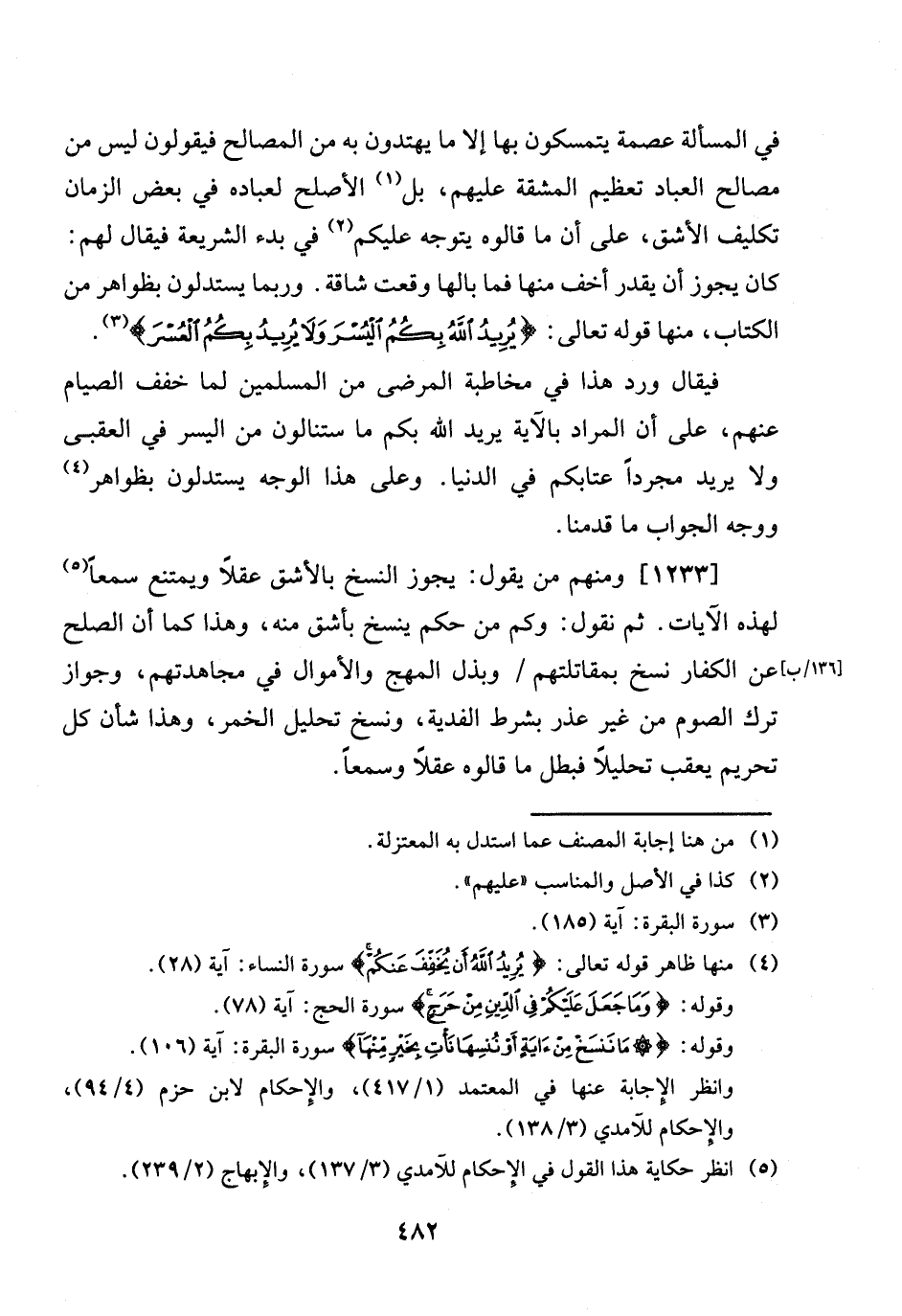 [1233] وَمِنْهُم من يَقُول: يجوز النّسخ بالأشق عقلا وَيمْتَنع سمعا لهَذِهِ الْآيَات. ثمَّ نقُول: وَكم من حكم ينْسَخ بأشق مِنْهُ، وَهَذَا كَمَا أَن الصُّلْح [136 / ب] عَن الْكفَّار نسخ بمقاتلتهم / وبذل المهج وَالْأَمْوَال فِي مجاهدتهم، وَجَوَاز ترك الصَّوْم من غير عذر بِشَرْط الْفِدْيَة، وَنسخ حليل الختمر، وَهَذَا شَأْن كل تَحْرِيم يعقب تحليلا فَبَطل مَا قَالُوهُ عقلا وسمعا.