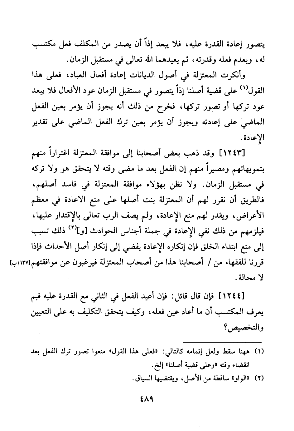 [1243] وَقد ذهب بعض أَصْحَابنَا إِلَى مُوَافقَة الْمُعْتَزلَة اغْتِرَارًا مِنْهُم بتمويهاتهم ومصيرا مِنْهُم إِن الْفِعْل بعد مَا مضى وقته لَا يتَحَقَّق هُوَ وَلَا تَركه فِي مُسْتَقْبل الزَّمَان. وَلَا نظن بهؤلاء مُوَافقَة الْمُعْتَزلَة فِي فَاسد أصلهم، فالطريق أَن نقرر لَهُم أَن الْمُعْتَزلَة بنت أَصْلهَا على منع الاعادة فِي مُعظم الْأَعْرَاض، وَيقدر لَهُم منع الْإِعَادَة، وَلم يصف الرب تَعَالَى بالإقتدار عَلَيْهَا، فيلزمهم من ذَلِك نفي الْإِعَادَة فِي جملَة أَجنَاس الْحَوَادِث [و] ذَلِك تسبب إِلَى منع ابْتِدَاء الْخلق فَإِن إِنْكَاره الْإِعَادَة يُفْضِي إِلَى إِنْكَار أصل الْأَحْدَاث فَإِذا قَررنَا للفقهاء من / أَصْحَابنَا هَذَا من اصحاب الْمُعْتَزلَة فيرغبون عَن موافقتهم [137 / ب] لَا محَالة.