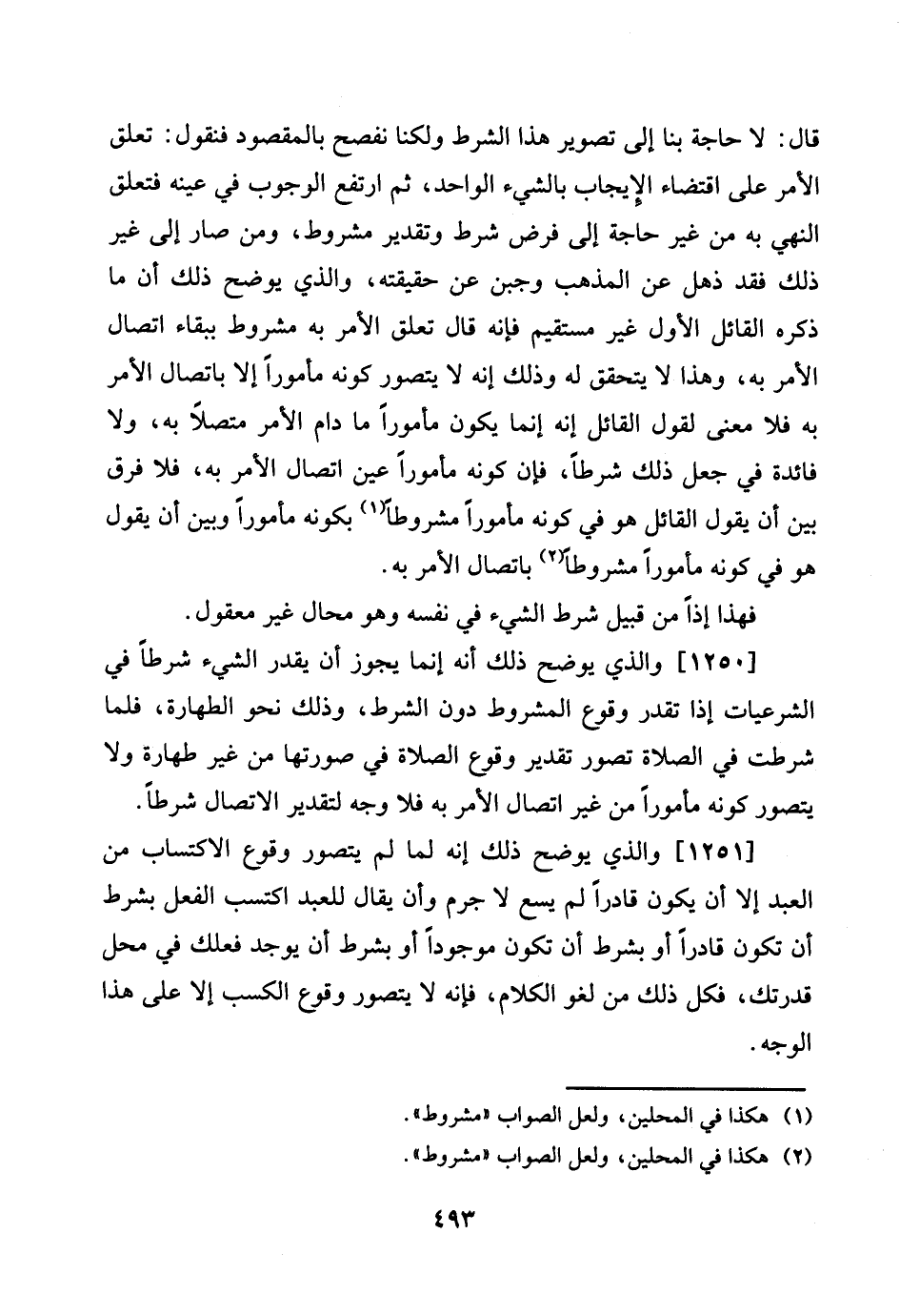 [1250] وَالَّذِي يُوضح ذَلِك أَنه إِنَّمَا يجوز أَن يقدر الشَّيْء شرطا فِي الشرعيات إِذا تقدر وُقُوع الْمَشْرُوط دون الشَّرْط، وَذَلِكَ نَحْو الطَّهَارَة، فَلَمَّا شرطت فِي الصَّلَاة تصور تَقْدِير وُقُوع الصَّلَاة فِي صورتهَا من غير طَهَارَة وَلَا يتَصَوَّر كَونه مَأْمُورا من غير اتِّصَال الْأَمر بِهِ فَلَا وَجه لتقدير الِاتِّصَال شرطا.
