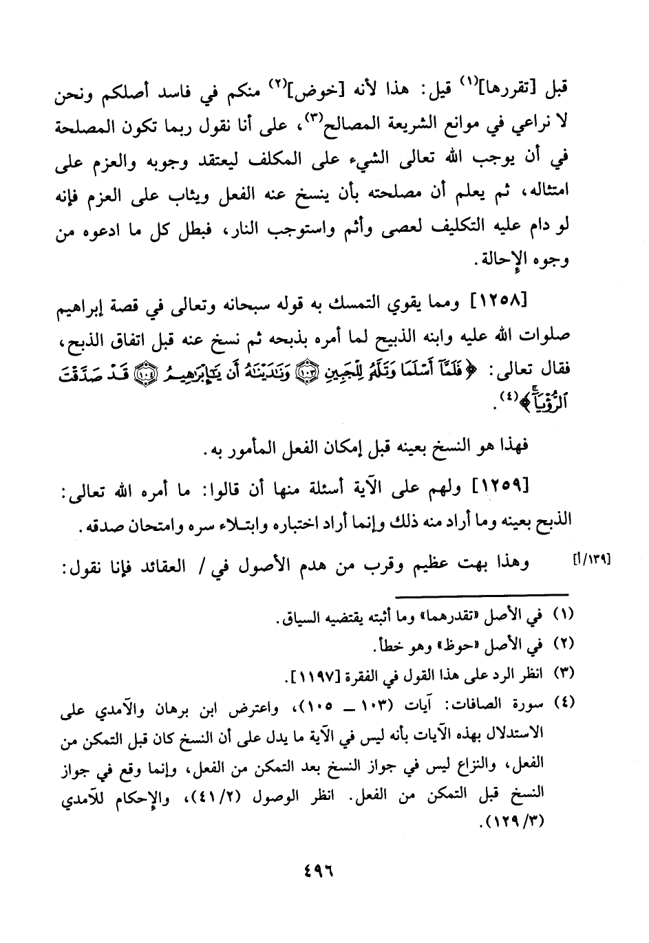 قبل [تقررها] قيل: هَذَا لِأَنَّهُ [خوض] مِنْكُم فِي فَاسد أصلكم وَنحن لَا نراعي فِي مَوَانِع الشَّرِيعَة الْمصَالح، على أَنا نقُول رُبمَا تكون الْمصلحَة فِي أَن يُوجب الله تَعَالَى الشَّيْء على الْمُكَلف ليعتقد وُجُوبه والعزم على امتثاله، ثمَّ يعلم أَن مصْلحَته بَان ينْسَخ عَنهُ الْفِعْل ويثاب على الْعَزْم فَإِنَّهُ لَو دَامَ عَلَيْهِ التَّكْلِيف لعصى وأثم واستوجب النَّار، فَبَطل كل مَا ادعوهُ من وُجُوه الإحالة.
