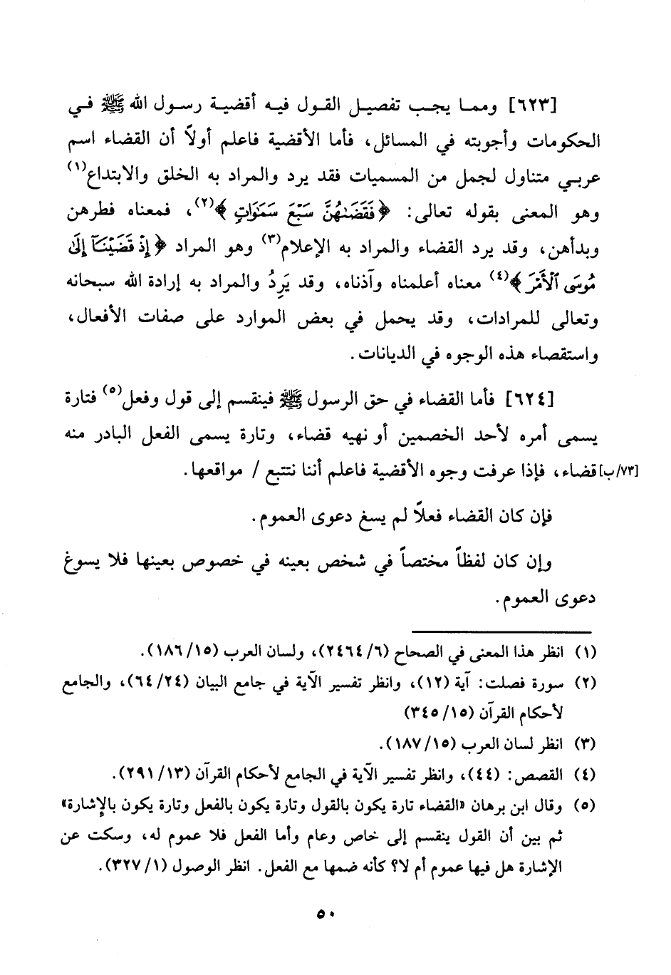 [623] وَمِمَّا يجب تَفْصِيل القَوْل فِيهِ أقضية رَسُول الله صلى الله عَلَيْهِ وَسلم فِي الحكومات وأجوبته فِي الْمسَائِل، فَأَما الْأَقْضِيَة فَاعْلَم أَولا أَن الْقَضَاء اسْم عَرَبِيّ متناول لجمل من المسميات فقد يرد وَالْمرَاد بِهِ الْخلق والابتداع وَهُوَ الْمَعْنى بقوله تَعَالَى: {فقضهن سبع سموات} ، فَمَعْنَاه فطرهن وبدأهن، وَقد يرد الْقَضَاء وَالْمرَاد بِهِ الْإِعْلَام وَهُوَ المُرَاد {إِذا قضينا إِلَى مُوسَى الْأَمر} مَعْنَاهُ أعلمناه وآذاناه، وَقد يرد وَالْمرَاد بِهِ إِرَادَة الله سُبْحَانَهُ وَتَعَالَى للمرادات، وَقد يحمل فِي بعض الْمَوَارِد على صِفَات الْأَفْعَال، واستقصاء هَذِه الْوُجُوه فِي الديانَات.