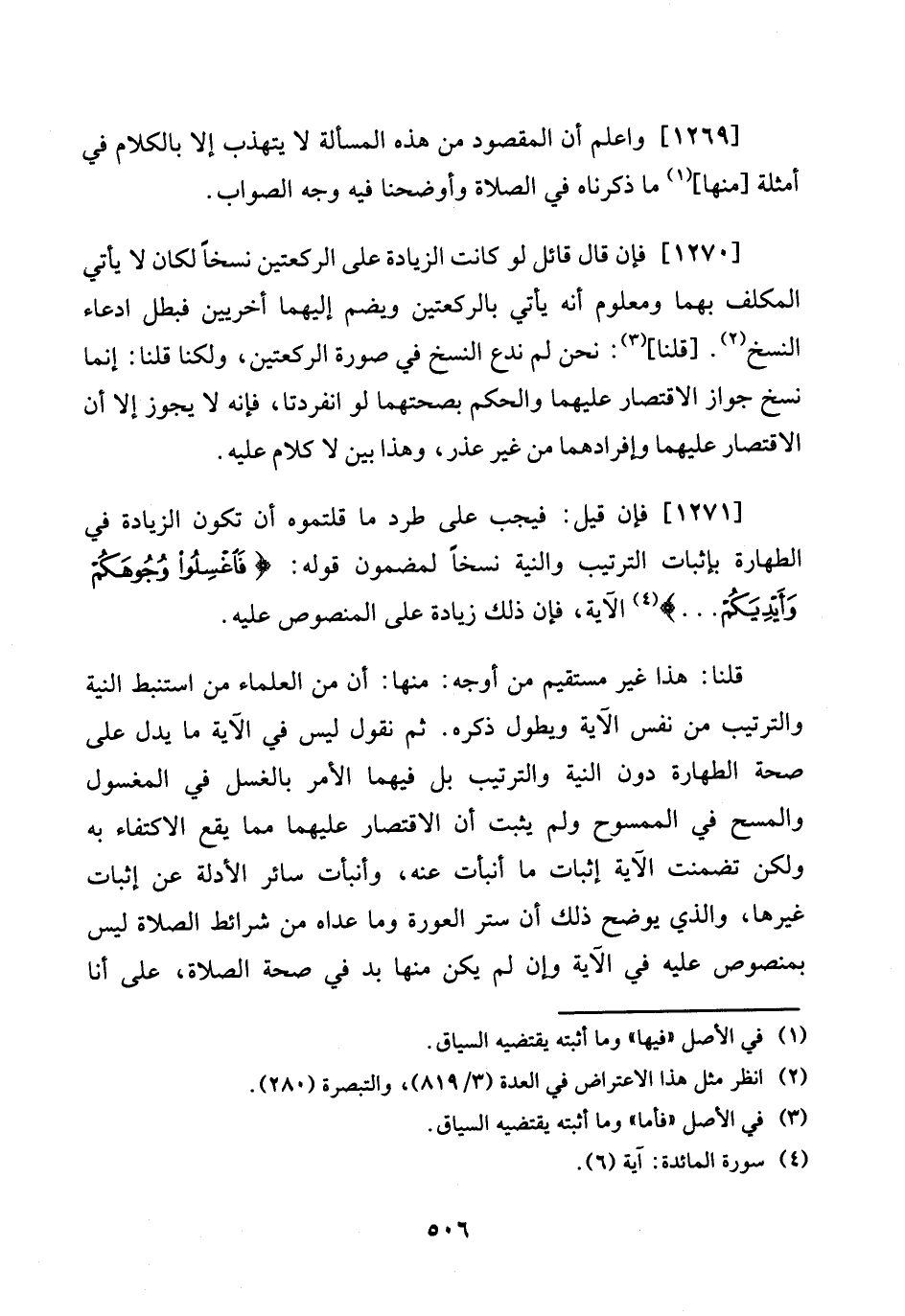 [1271] فَإِن قيل: فَيجب على طرد مَا قلتموه أَن تكون الزِّيَادَة فِي الطَّهَارَة بِإِثْبَات التَّرْتِيب وَالنِّيَّة نسخا لمضمون قَوْله: {فَاغْسِلُوا وُجُوهكُم وَأَيْدِيكُمْ} الْآيَة، فَإِن ذَلِك زِيَادَة على الْمَنْصُوص عَلَيْهِ.
