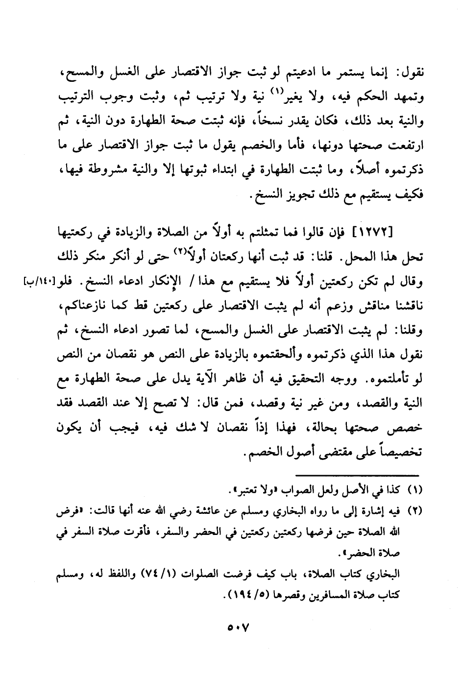 [1272] فَإِن قَالُوا فِيمَا تمثلتم بِهِ أَولا من الصَّلَاة وَالزِّيَادَة فِي ركعتيها تحل هَذَا الْمحل. قُلْنَا: قد ثَبت أَنَّهَا رَكْعَتَانِ أَولا حَتَّى لَو أنكر مُنكر ذَلِك وَقَالَ لم تكن رَكْعَتَيْنِ أَولا فَلَا يَسْتَقِيم مَعَ هَذَا / الْإِنْكَار ادِّعَاء النّسخ. فَلَو [140 / ب] ناقشنا مناقش وَزعم أَنه لم يثبت الِاقْتِصَار على رَكْعَتَيْنِ قطّ كَمَا نازعناكم، وَقُلْنَا: لم يثبت الِاقْتِصَار على الْغسْل وَالْمسح، لما تصور ادِّعَاء النّسخ، ثمَّ نقُول هَذَا الَّذِي ذكرتموه وألحقتموه بِالزِّيَادَةِ على النَّص هُوَ نُقْصَان من النَّص لَو تأملتموه. وَوجه التَّحْقِيق فِيهِ أَن ظَاهر الْآيَة يدل على صِحَة الطَّهَارَة مَعَ النِّيَّة وَالْقَصْد، وَمن غير نِيَّة وَقصد، فَمن قَالَ: لَا تصح إِلَّا عِنْد الْقَصْد فقد خصص صِحَّتهَا بِحَالَة، فَهَذَا إِذا نُقْصَان لَا شكّ فِيهِ، فَيجب أَن يكون تَخْصِيصًا على مُقْتَضى أصُول الْخصم.