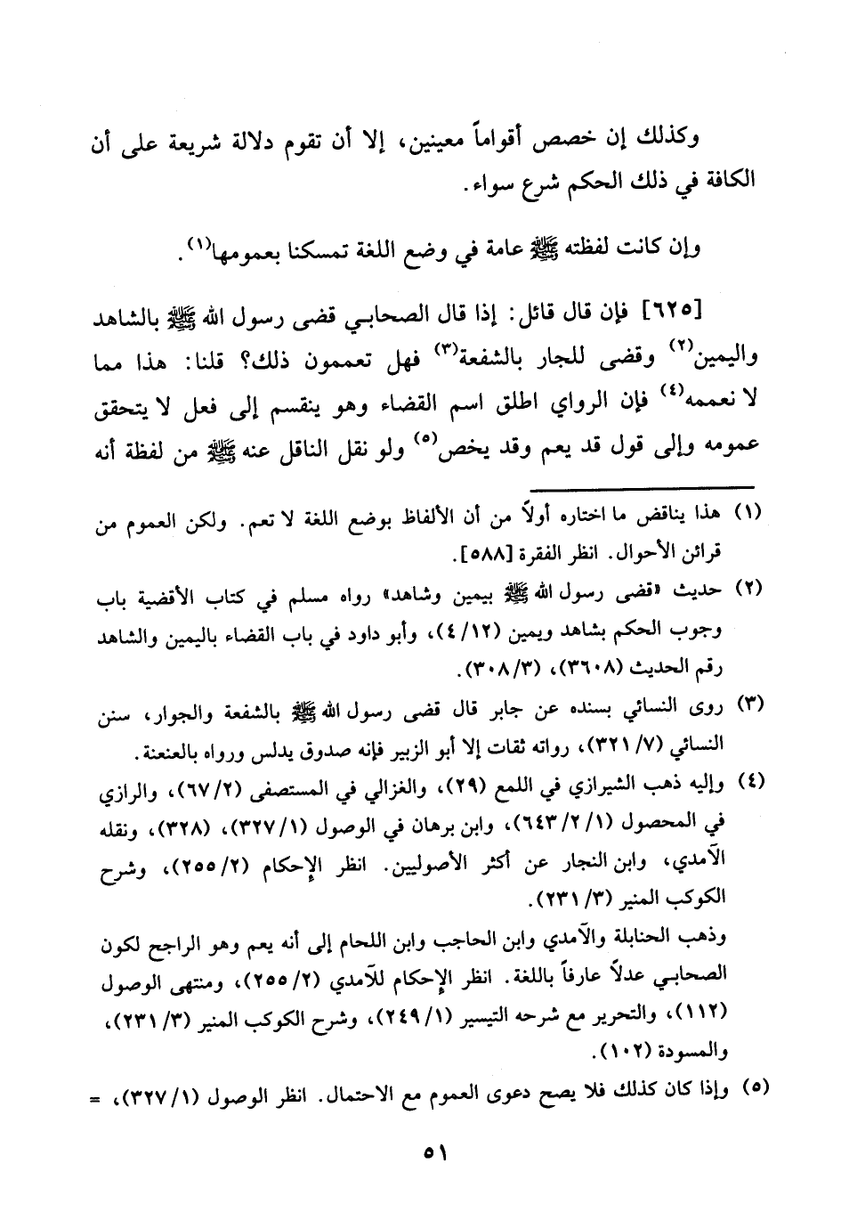 [625] فَإِن قَالَ قَائِل: إِذا قَالَ الصَّحَابِيّ قضى رَسُول الله صلى الله عَلَيْهِ وَسلم بِالشَّاهِدِ وَالْيَمِين وَقضى للْجَار بِالشُّفْعَة فَهَل تعممون ذَلِك؟ قُلْنَا: هَذَا مِمَّا لَا نعممه فَإِن الرواي اطلق اسْم الْقَضَاء وَهُوَ يَنْقَسِم إِلَى فعل لَا يتَحَقَّق عُمُومه وَإِلَى قَول قد يعم وَقد يخص وَلَو نقل النَّاقِل عَنهُ صلى الله عَلَيْهِ وَسلم من لَفظه أَنه