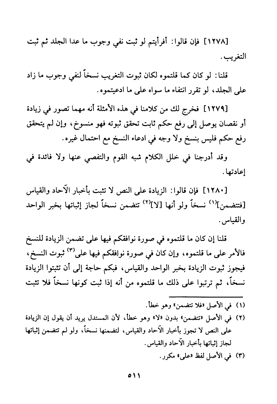 [1280] فَإِن قَالُوا: الزِّيَادَة على النَّص لَا تثبت بأخبار الاحاد وَالْقِيَاس [فتتضمن] نسخا وَلَو أَنَّهَا [لَا] تَتَضَمَّن نسخا لجَاز إِثْبَاتهَا بِخَبَر الْوَاحِد وَالْقِيَاس. \ قُلْنَا إِن كَانَ مَا قلتموه فِي صُورَة نوافقكم فِيهِ على تضمن الزِّيَادَة للنسخ فَالْأَمْر على مَا قلتموه، وَإِن كَانَ فِي صُورَة نوافقكم فِيهَا على ثُبُوت النّسخ، فَيجوز ثُبُوت الزِّيَادَة بِخَبَر الْوَاحِد وَالْقِيَاس، فبكم حَاجَة إِلَى أَن تثبتوا الزِّيَادَة نسخا، ثمَّ ترتبوا على ذَلِك مَا قلتموه من أَنه إِذا ثَبت كَونهَا نسخا فَلَا تثبت