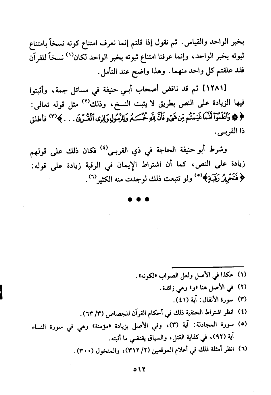 [1281] ثمَّ قد نَاقض أَصْحَاب أبي حنيفَة فِي مسَائِل جمة، واثبتوا فِيهَا الزِّيَادَة على النَّص بطرِيق لَا يثبت النّسخ، وَذَلِكَ مثل قَوْله تَعَالَى: {وَاعْلَمُوا أَنما غَنِمْتُم من شَيْء فَأن لله خَمْسَة وَلِلرَّسُولِ لذِي الْقُرْبَى. .} فَأطلق ذَا الْقُرْبَى.
