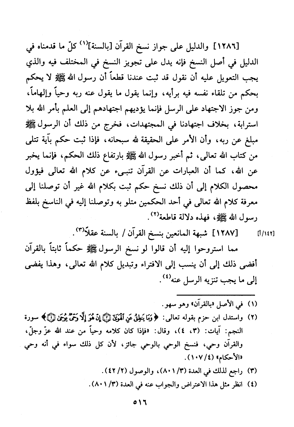 [1286] وَالدَّلِيل على جَوَاز نسخ الْقرَان [بِالسنةِ] كل مَا قدمْنَاهُ فِي الدَّلِيل فِي اصل النّسخ فَإِنَّهُ يدل على تَجْوِيز النّسخ فِي الْمُخْتَلف فِيهِ وَالَّذِي يجب التعويل عَلَيْهِ أَن نقُول قد ثَبت عندنَا قطعا أَن رَسُول الله صلى الله عَلَيْهِ وَسلم لَا يحكم بِحكم من تِلْقَاء نَفسه فِيهِ بِرَأْيهِ، وَإِنَّمَا يَقُول مَا يَقُول عَنهُ ربه وَحيا وإلهاما، وَمن جوز الِاجْتِهَاد على الرُّسُل فَإِنَّمَا يؤديهم اجتهادهم إِلَى الْعلم بِأَمْر الله بِلَا استرابة، بِخِلَاف اجتهادنا فِي المجتهدات، فَخرج من ذَلِك أَن الرَّسُول صلى الله عَلَيْهِ وَسلم مبلغ عَن ربه، وَأَن الْأَمر على الْحَقِيقَة لله سُبْحَانَهُ، فَإِذا ثَبت حكم بِآيَة تتلى من كتاب الله تَعَالَى، ثمَّ أخبر رَسُول الله صلى الله عَلَيْهِ وَسلم بارتفاع ذَلِك الحكم، فَإِنَّمَا يخبر عَن الله، كَمَا أَن الْعبارَات عَن الْقُرْآن تنبيىء عَن كَلَام الله تَعَالَى فيؤول محصول الْكَلَام إِلَى أَن ذَلِك نسخ حكم ثَبت بِكَلَام الله غير ان توصلنا إِلَى معرفَة كَلَام الله تَعَالَى فِي أحد الْحكمَيْنِ متلو بِهِ وتوصلنا إِلَيْهِ فِي النَّاسِخ بِلَفْظ رَسُول الله صلى الله عَلَيْهِ وَسلم، فَهَذِهِ دلَالَة قَاطِعَة.