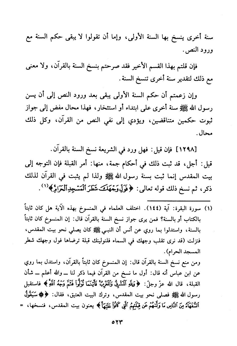 [1298] فَإِن قيل: فَهَل ورد فِي الشَّرِيعَة نسخ السّنة بِالْقُرْآنِ. قيل: اجل، قد ثَبت ذَلِك فِي أَحْكَام جمة، مِنْهَا: أَمر الْقبْلَة فَإِن التَّوَجُّه إِلَى بَيت الْمُقَدّس إِنَّمَا ثَبت بِسنة رَسُول الله صلى الله عَلَيْهِ وَسلم وَلذَا لم يثبت فِي الْقُرْآن لذَلِك ذكر، ثمَّ نسخ ذَلِك قَوْله تَعَالَى: {فول وَجهك شطر الْمَسْجِد الْحَرَام}