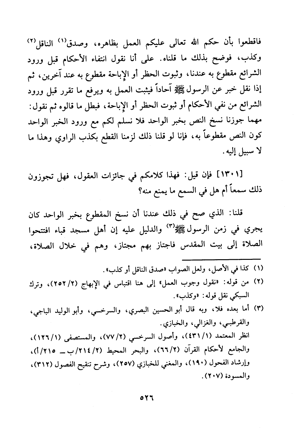 فَاقْطَعُوا بَان حكم الله تَعَالَى عَلَيْكُم الْعَمَل بِظَاهِرِهِ، وَصدق النَّاقِل وَكذب، فوضح بذلك مَا قُلْنَاهُ. على أَنا نقُول انْتِفَاء الْأَحْكَام قبل وُرُود الشَّرَائِع مَقْطُوع بِهِ عندنَا، وَثُبُوت الْحَظْر أَو الْإِبَاحَة مَقْطُوع بِهِ عِنْد آخَرين، ثمَّ إِذا نقل خبر عَن الرَّسُول صلى الله عَلَيْهِ وَسلم آحادا فَيثبت الْعَمَل بِهِ وَيرْفَع مَا تقرر قبل وُرُود الشَّرَائِع من نفي الْأَحْكَام أَو ثُبُوت الْحَظْر أَو الْإِبَاحَة، فَبَطل مَا قَالُوهُ ثمَّ نقُول: مهما جَوَّزنَا نسخ النَّص بِخَبَر الْوَاحِد فَلَا نسلم لكم مَعَ وُرُود الْخَبَر الْوَاحِد كَون النَّص مَقْطُوعًا بِهِ، فَإنَّا لَو قُلْنَا ذَلِك لزمنا الْقطع بكذب الرَّاوِي وَهَذَا مَا لَا سَبِيل إِلَيْهِ.