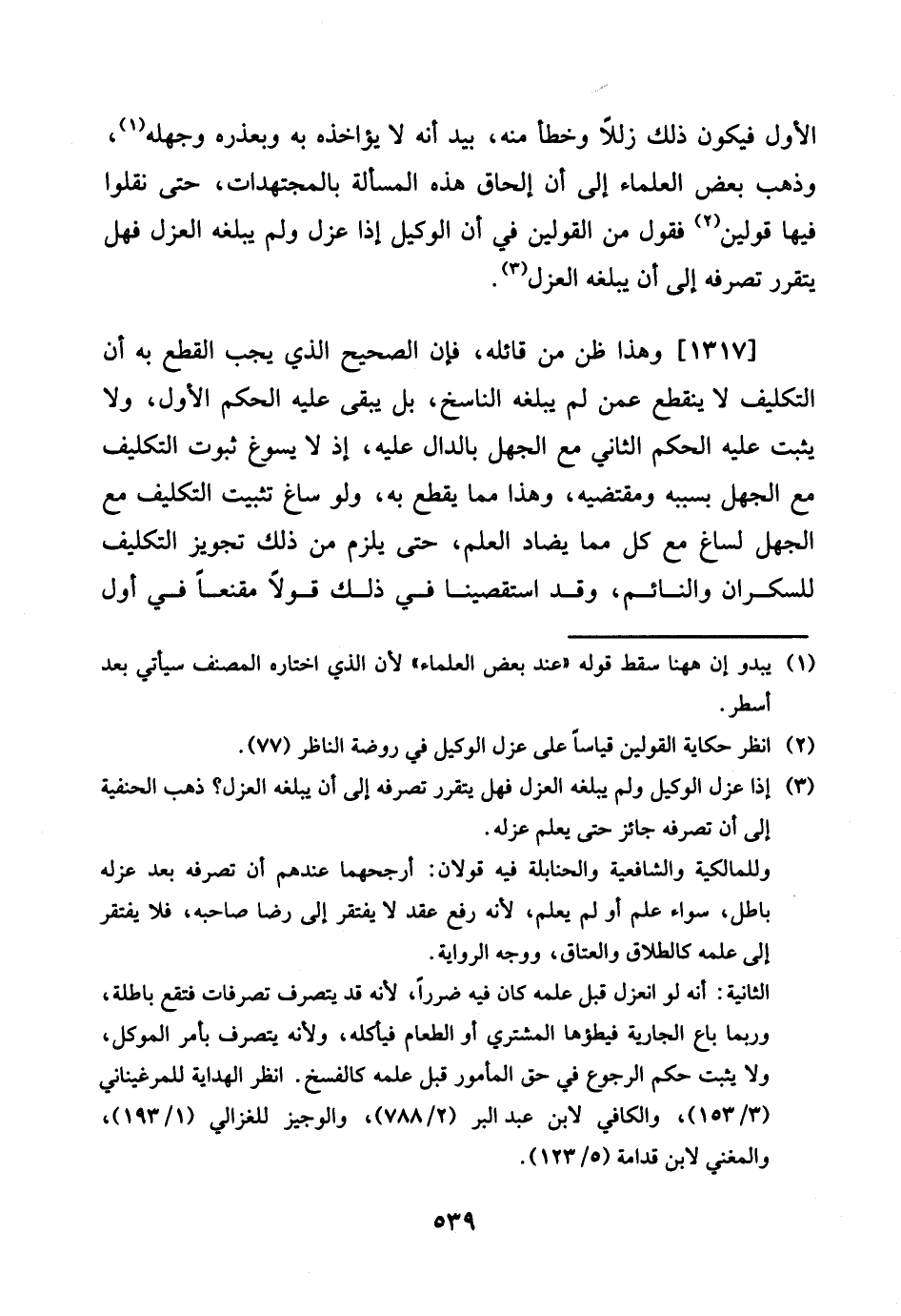 الأول فَيكون ذَلِك زللا وَخطأ مِنْهُ، بيد أَنه لَا يؤاخذه بِهِ وبعذره وجهله، وَذهب بعض الْعلمَاء إِلَى أَن إِلْحَاق هَذِه الْمَسْأَلَة بالمجتهدات، حَتَّى نقلوا فِيهَا قَوْلَيْنِ فَقَوْل من الْقَوْلَيْنِ فِي أَن الْوَكِيل إِذا عزل وَلم يبلغهُ الْعَزْل فَهَل يَتَقَرَّر تصرفه إِلَى أَن يبلغهُ الْعَزْل.