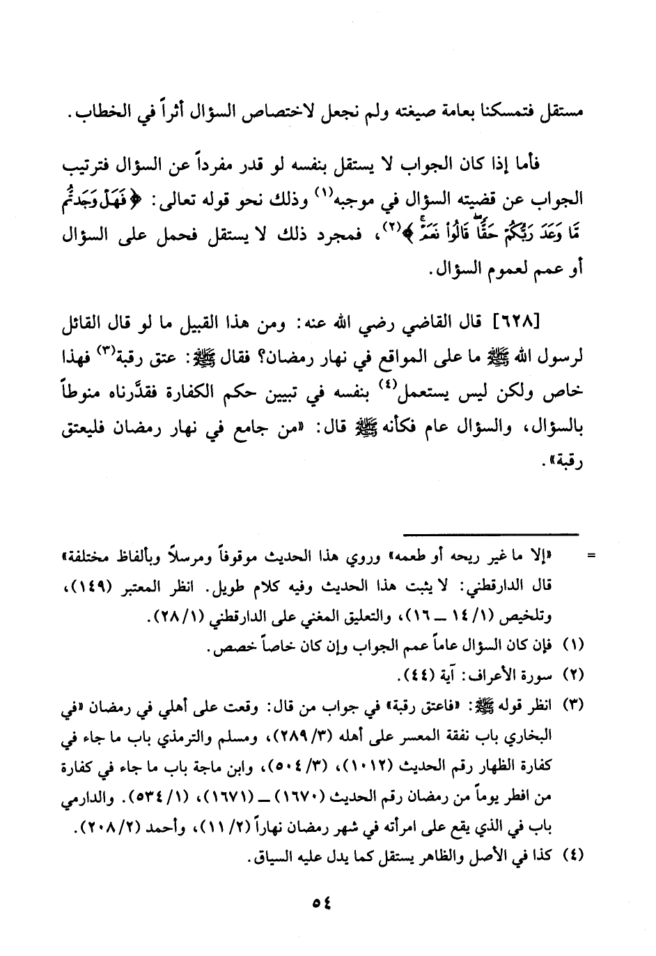 [628] قَالَ القَاضِي رَضِي الله عَنهُ: وَمن هَذَا الْقَبِيل مَا لَو قَالَ الْقَائِل لرَسُول الله لَهُ صلى الله عَلَيْهِ وَسلم مَا على المواقع فِي نَهَار رَمَضَان؟ فَقَالَ صلى الله عَلَيْهِ وَسلم: عتق رَقَبَة فَهَذَا خَاص وَلَكِن لَيْسَ يسْتَعْمل بِنَفسِهِ فِي تَبْيِين حكم الْكَفَّارَة فقدرناه مَنُوطًا بالسؤال، وَالسُّؤَال عَام فَكَأَنَّهُ صلى الله عَلَيْهِ وَسلم قَالَ: " من جَامع فِي نَهَار رَمَضَان فليعتق رَقَبَة ".