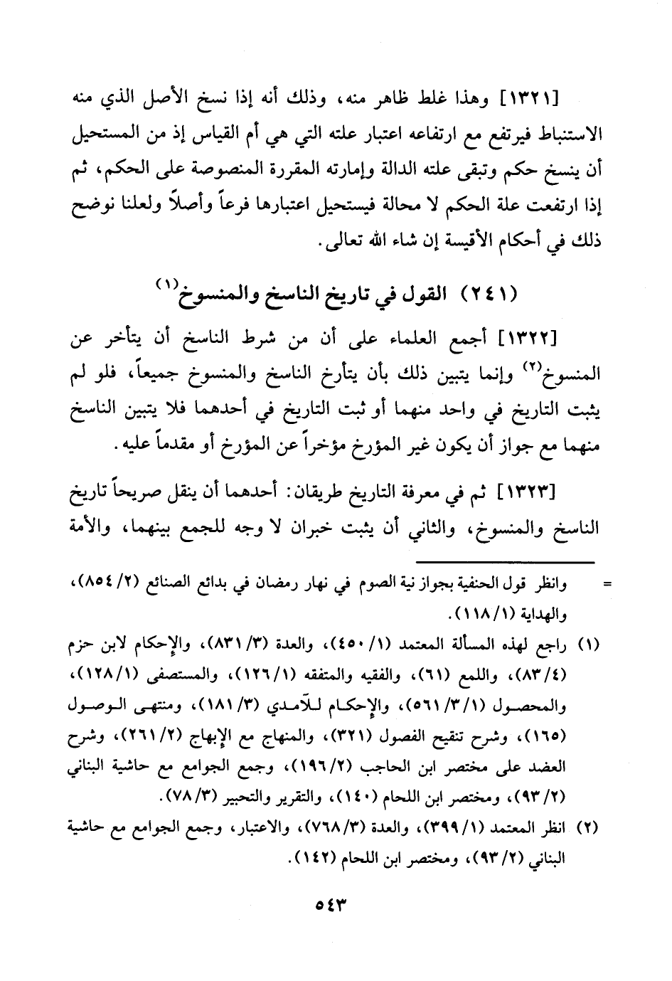 [1322] أمع الْعلمَاء على أَن من شَرط النَّاسِخ أَن يتَأَخَّر عَن الْمَنْسُوخ وَإِنَّمَا يتَبَيَّن ذَلِك بِأَن يتأرخ النَّاسِخ والمنسوخ جَمِيعًا، فَلَو لم يثبت التَّارِيخ فِي وَاحِد مِنْهُمَا أَو ثَبت التَّارِيخ فِي أَحدهمَا فَلَا يتَبَيَّن النَّاسِخ مِنْهُمَا مَعَ جَوَاز أَن يكون غير المؤرخ مُؤَخرا عَن المؤرخ أَو مقدما عَلَيْهِ.