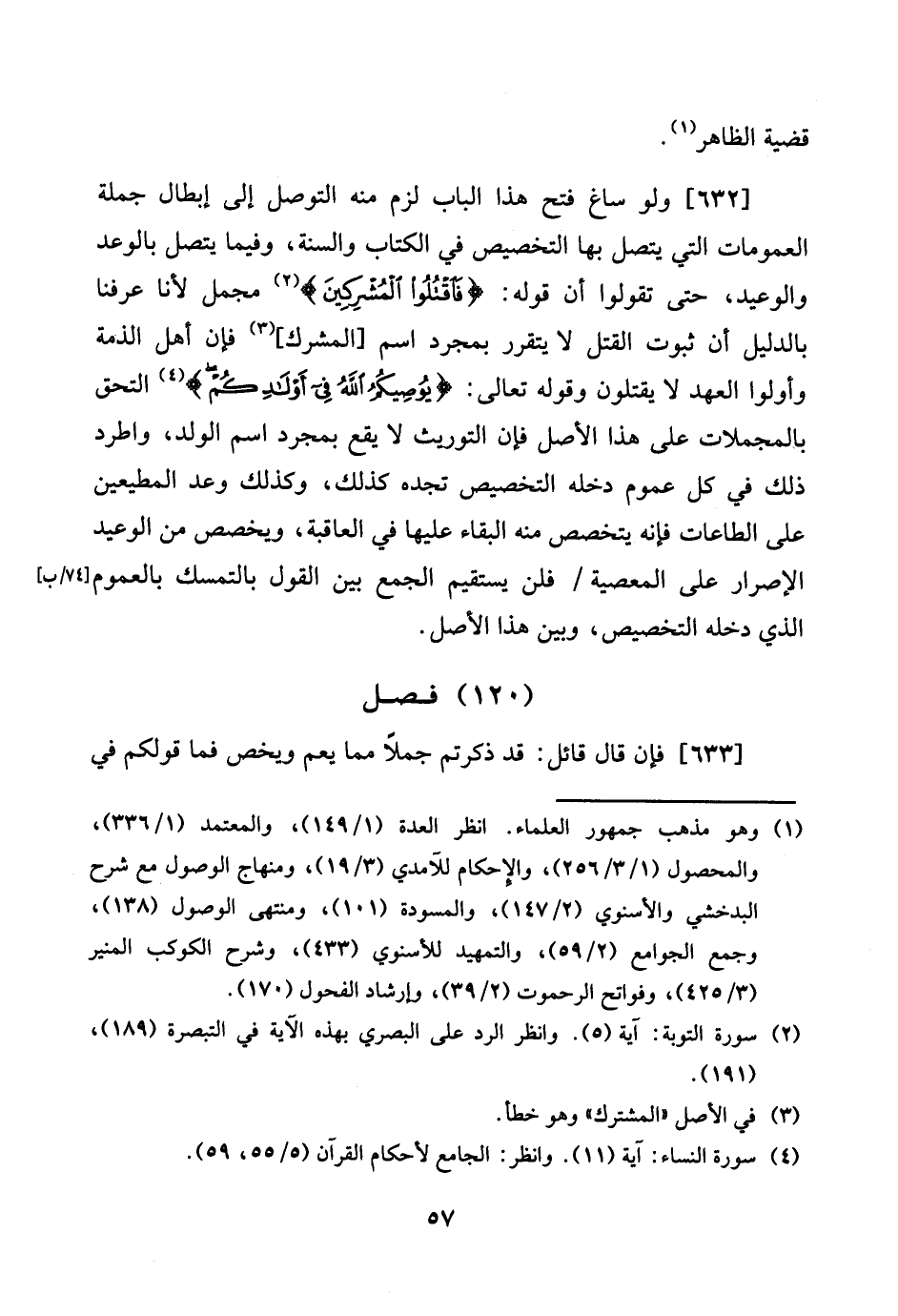 [632] وَلَو سَاغَ فتح هَذَا الْبَاب لزم مِنْهُ التَّوَصُّل إِلَى إبِْطَال جملَة العمومات الَّتِي يتَّصل بهَا التَّخْصِيص فِي الْكتاب وَالسّنة، وَفِيمَا يتَّصل بالوعد والوعيد، حَتَّى تَقولُوا أَن قَوْله: {فَاقْتُلُوا الْمُشْركين} مُجمل لأَنا عرفنَا بِالدَّلِيلِ أَن ثُبُوت الْقَتْل لَا يَتَقَرَّر بِمُجَرَّد اسْم [الْمُشرك] فَإِن أهل الذِّمَّة وَأولُوا الْعَهْد لَا يقتلُون وَقَوله تَعَالَى: {يُوصِيكُم الله فِي أولدكم} الْتحق بالمجملات على هَذَا الأَصْل فَإِن التوريث لَا يَقع بِمُجَرَّد اسْم الْوَلَد، واطرد ذَلِك فِي كل عُمُوم دخله التَّخْصِيص تَجدهُ كَذَلِك، وَكَذَلِكَ وعد المطيعين على الطَّاعَات فَإِنَّهُ يتخصص مِنْهُ الْبَقَاء عَلَيْهَا فِي الْعَاقِبَة، ويخصص من الْوَعيد الْإِصْرَار على الْمعْصِيَة / فَلَنْ يَسْتَقِيم الْجمع بَين القَوْل بالتمسك بِالْعُمُومِ [74 / ب] الَّذِي دخله التَّخْصِيص، وَبَين هَذَا الأَصْل.