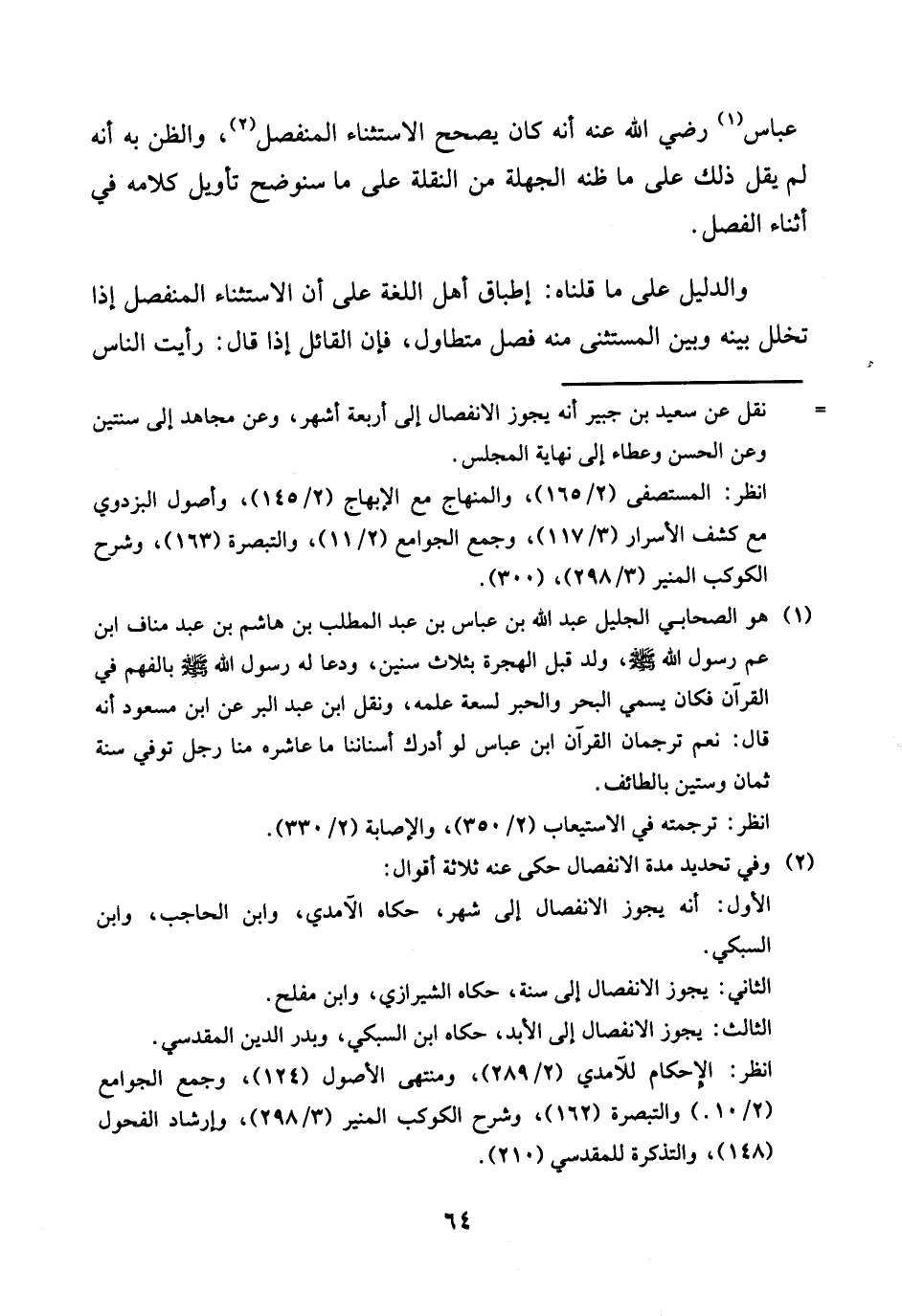 عَبَّاس رَضِي الله عَنهُ أَنه كَانَ يصحح الِاسْتِثْنَاء الْمُنْفَصِل، وَالظَّن بِهِ أَنه لم يقل ذَلِك على مَا ظَنّه الجهلة من النقلَة على مَا سنوضح تَأْوِيل كَلَامه فِي أثْنَاء الْفَصْل.