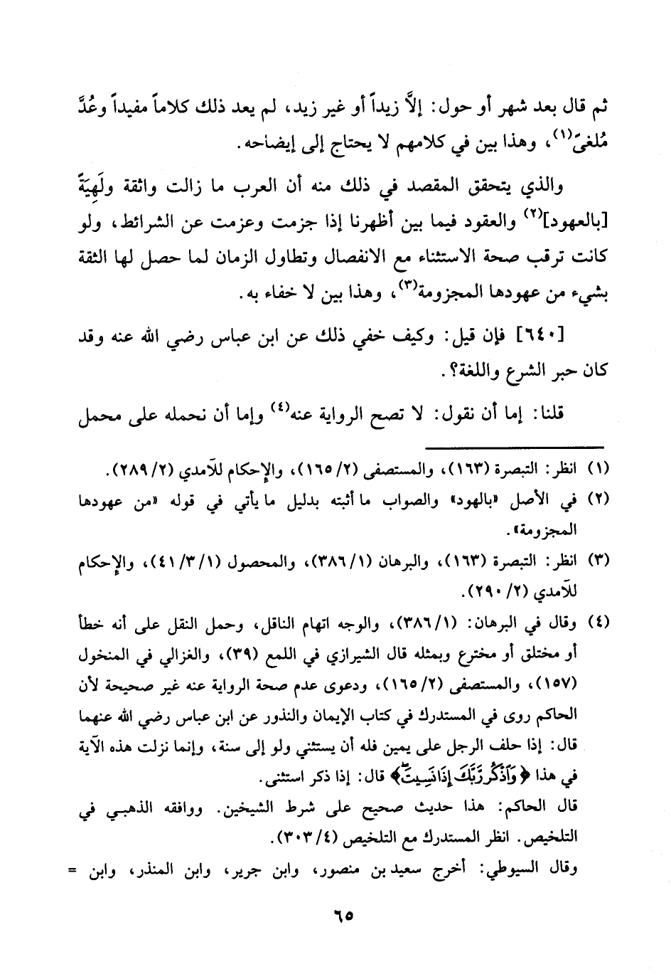 وَالَّذِي يتَحَقَّق الْمَقْصد فِي ذَلِك مِنْهُ أَن الْعَرَب مَا زَالَت واثقة وتهيئة [بالعهود] والعقود فِيمَا بَين أظهرنَا إِذا جزمت وعزمت عَن الشَّرَائِط، وَلَو كَانَت ترقب صِحَة الِاسْتِثْنَاء مَعَ الِانْفِصَال وتطاول الزَّمَان لما حصل لَهَا الثِّقَة بِشَيْء من عهودها المجزومة، وَهَذَا بَين لَا خَفَاء بِهِ.