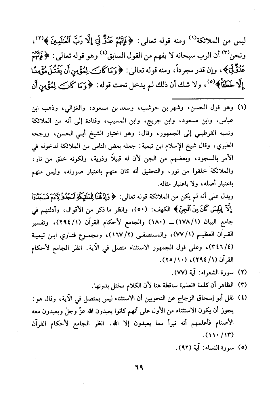 لَيْسَ من الْمَلَائِكَة وَمِنْه قَوْله تَعَالَى: {فَإِنَّهُم عَدو لي إِلَّا رب الْعَالمين} ، وَنحن أَن الرب سُبْحَانَهُ لَا يفهم من القَوْل السَّابِق وَهُوَ قَوْله تَعَالَى: {فَإِنَّهُم عَدو لي} ، وَإِن قدر مُجَردا، وَمِنْه قَوْله تَعَالَى: {وَمَا كَانَ لمُؤْمِن أَن يقتل مُؤمنا إِلَّا خطأ} ، وَلَا شكّ أَن ذَلِك لم يدْخل تَحت قَوْله: (وَمَا كَانَ لمُؤْمِن أَن