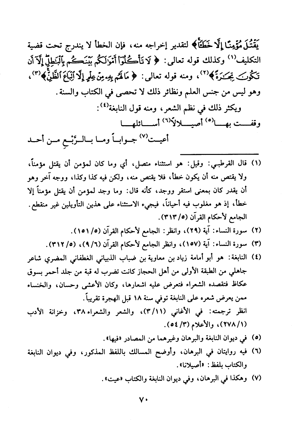 يقتل مُؤمنا إِلَّا خطئاً} لتقدير إِخْرَاجه مِنْهُ، فَإِن الْخَطَأ لَا ينْدَرج تَحت قَضِيَّة التَّكْلِيف وَكَذَلِكَ قَوْله تَعَالَى: {لَا تَأْكُلُوا أَمْوَالكُم بَيْنكُم بِالْبَاطِلِ إِلَّا أَن تكون تِجَارَة} ، وَمِنْه قَوْله تَعَالَى: {مَا لَهُم بِهِ من علم إِلَّا اتِّبَاع الظَّن} ، وَهُوَ لَيْسَ من جنس الْعلم ونظائر ذَلِك لَا تحصى فِي الْكتاب وَالسّنة.