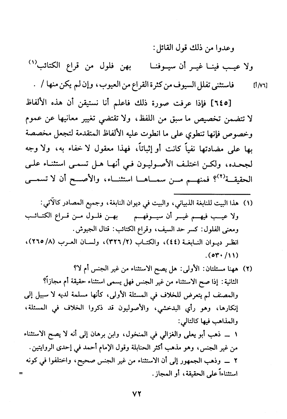 [645] فَإِذا عرفت صُورَة ذَلِك فَاعْلَم أَنا نستيقن أَن هَذِه الْأَلْفَاظ لَا تَتَضَمَّن تَخْصِيص مَا سبق من اللَّفْظ، وَلَا تَقْتَضِي تَغْيِير مَعَانِيهَا عَن عُمُوم وخصوص فَإِنَّهَا تنطوي على مَا انطوت عَلَيْهِ الْأَلْفَاظ الْمُتَقَدّمَة لتجعل مخصصة بهَا على مضادتها نفيا كَانَت أَو إِثْبَاتًا، فَهَذَا مَعْقُول لَا خَفَاء بِهِ، وَلَا وَجه لجحده، وَلَكِن اخْتلف االأصوليون فِي أَنَّهَا هَل تسمى اسْتثِْنَاء على الْحَقِيقَة؟ فَمنهمْ من سَمَّاهَا اسْتثِْنَاء، وَالأَصَح أَن لَا تسمى اسْتثِْنَاء