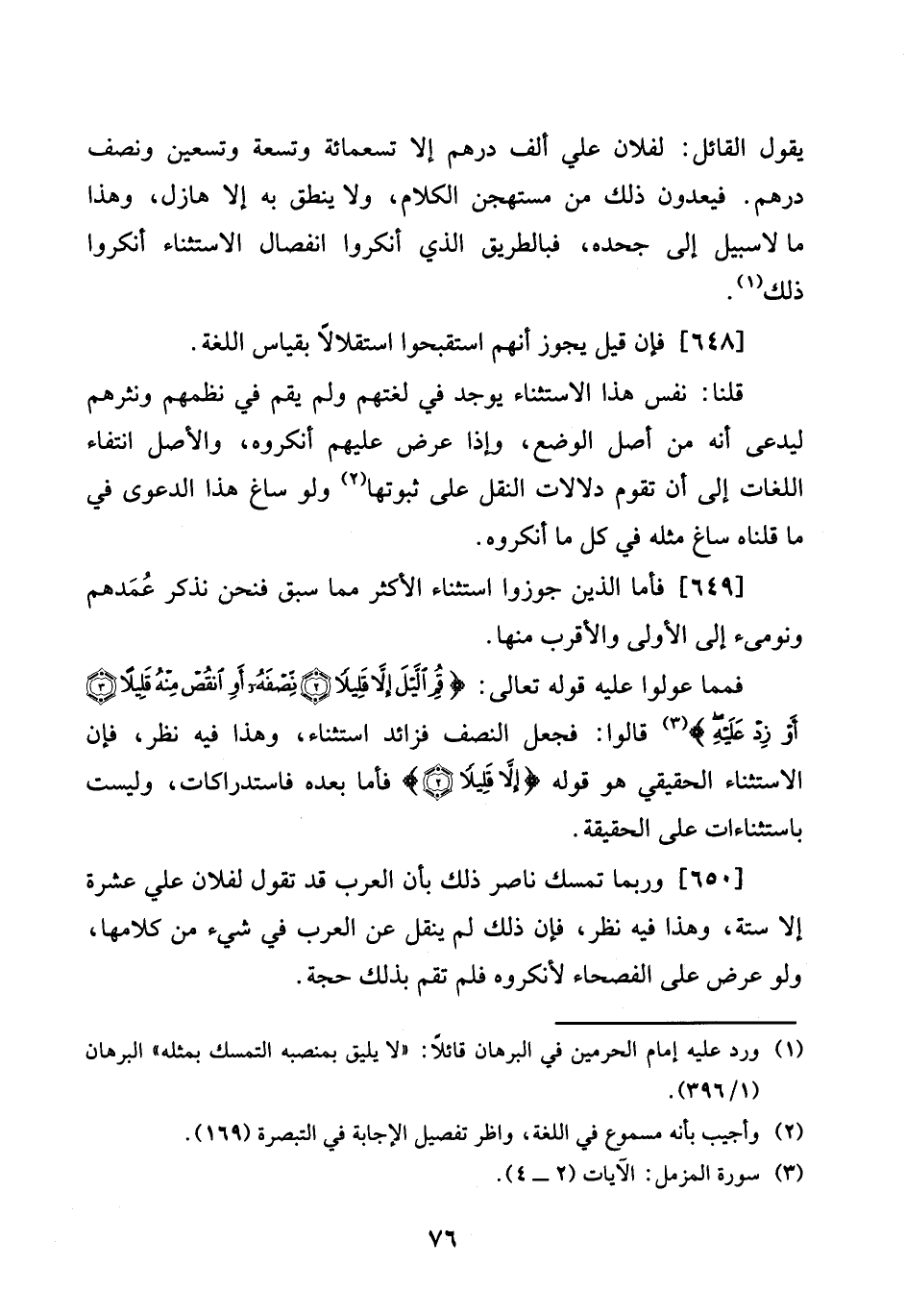 فمما عولوا عَلَيْهِ قَوْله تَعَالَى: {قُم اللَّيْل إِلَّا قَلِيلا نصفه أَو انقص مِنْهُ قَلِيلا أَو زد عَلَيْهِ} قَالُوا: فَجعل النّصْف فزائد اسْتثِْنَاء، وَهَذَا فِيهِ نظر، فَإِن الِاسْتِثْنَاء الْحَقِيقِيّ هُوَ قَوْله {إِلَّا قَلِيلا} فَأَما بعده فاستدراكات، وَلَيْسَت باسثتناءات على الْحَقِيقَة.