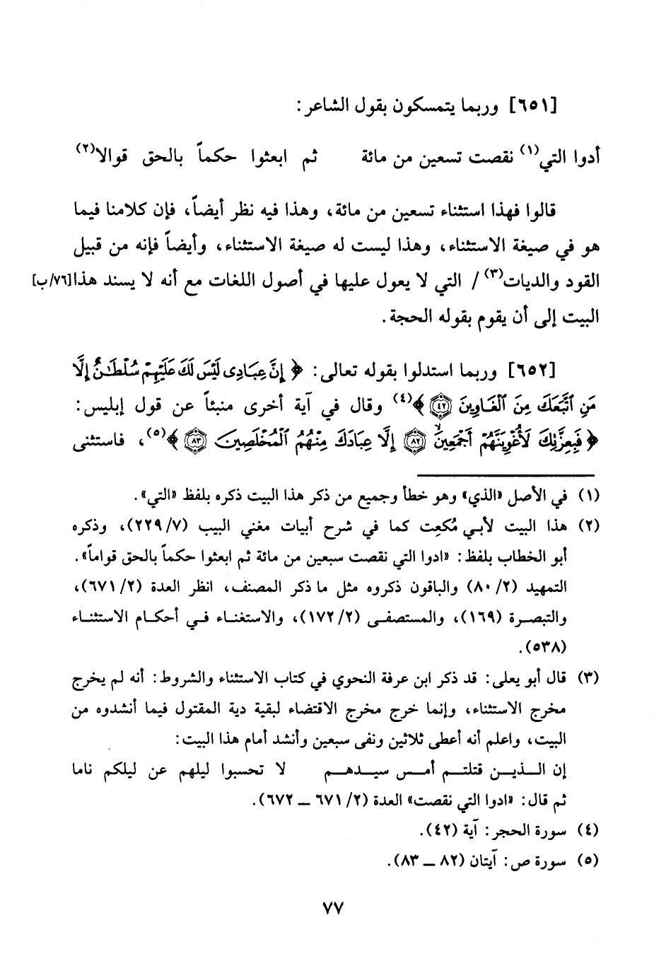 قَالُوا فَهَذَا اسْتثِْنَاء تسعين من مائَة، وَهَذَا فِيهِ نظر أَيْضا، فَإِن كلامنا فِيمَا هُوَ فِي صِيغَة الِاسْتِثْنَاء، وَهَذَا لَيست لَهُ صِيغَة الِاسْتِثْنَاء، وايضا فَإِنَّهُ من قبيل الْقود والديات / الَّتِي لَا يعول عَلَيْهَا فِي أصُول اللُّغَات مَعَ أَنه لَا يسند هَذَا [76 / ب] الْبَيْت إِلَى أَن يقوم بقوله الْحجَّة.