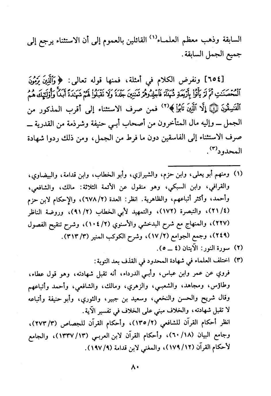 [654] ونفرض الْكَلَام فِي أَمْثِلَة، فَمِنْهَا قَوْله تَعَالَى: {وَالَّذين ير يرْمونَ الْمُحْصنَات ثمَّ لم يَأْتُوا بأَرْبعَة شُهَدَاء فَاجْلِدُوهُمْ ثَمَانِينَ جلدَة وَلَا تقبلُوا لَهُم شَهَادَة ابدا وَأُولَئِكَ هم الْفَاسِقُونَ إِلَّا الَّذين تَابُوا} فَمن صرف الِاسْتِثْنَاء إِلَى أقرب الْمَذْكُور من الْجمل ل - وَإِلَيْهِ مَال الْمُتَأَخّرُونَ من أَصْحَاب أبي حنيفَة وشرذمة من الْقَدَرِيَّة - صرف الِاسْتِثْنَاء إِلَى الْفَاسِقين دون مَا فرط من الْجمل، وَمن ذَلِك ردوا شَهَادَة الْمَحْدُود.