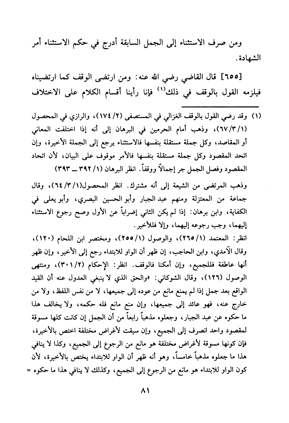 [655] قَالَ القَاضِي رَضِي الله عَنهُ: وَمن ارتضى الْوَقْف كَمَا ارتضيناه فَيلْزمهُ القَوْل بِالْوَقْفِ فِي ذَلِك فَإنَّا رَأينَا أَقسَام الْكَلَام على الِاخْتِلَاف