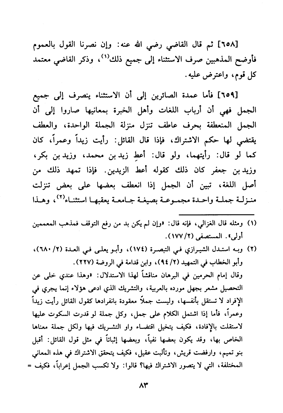 [658] ثمَّ قَالَ القَاضِي رَضِي الله عَنهُ: وَإِن نصرنَا القَوْل بِالْعُمُومِ فأوضح المذهبين صرف الِاسْتِثْنَاء إِلَى جَمِيع ذَلِك، وَذكر القَاضِي مُعْتَمد كل قوم، وَاعْترض عَلَيْهِ.