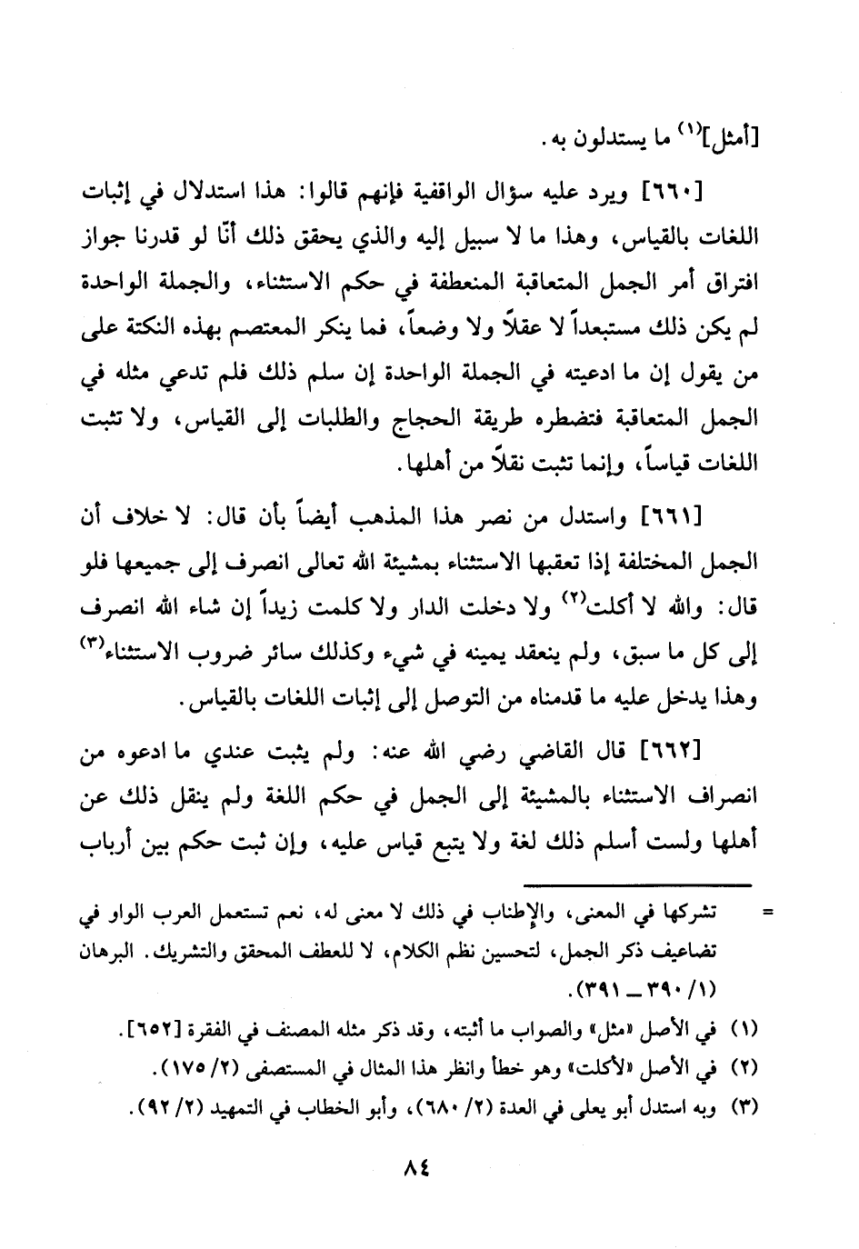 [660] وَيرد عَلَيْهِ سُؤال الواقفية فَإِنَّهُم قَالُوا: هَذَا اسْتِدْلَال فِي إِثْبَات اللُّغَات بِالْقِيَاسِ، وَهَذَا مَا لَا سَبِيل إِلَيْهِ وَالَّذِي يُحَقّق ذَلِك أَنا لَو قَدرنَا جَوَاز افْتِرَاق أَمر الْجمل المتعاقبة المنعطفة فِي حكم الِاسْتِثْنَاء، وَالْجُمْلَة الْوَاحِدَة لم يكن ذَلِك مستبعدا لَا عقلا وَلَا وضعا، فَمَا يُنكر المعتصم بِهَذِهِ النُّكْتَة على من يَقُول إِن مَا ادعيته فِي الْجُمْلَة الْوَاحِدَة إِن سلم ذَلِك فَلم تَدعِي مثله فِي الْجمل المتعاقبة فتضطره طَريقَة الْحجَّاج والطلبات إِلَى الْقيَاس، وَلَا تثبت اللُّغَات قِيَاسا، وَإِنَّمَا تثبت نقلا من أَهلهَا.