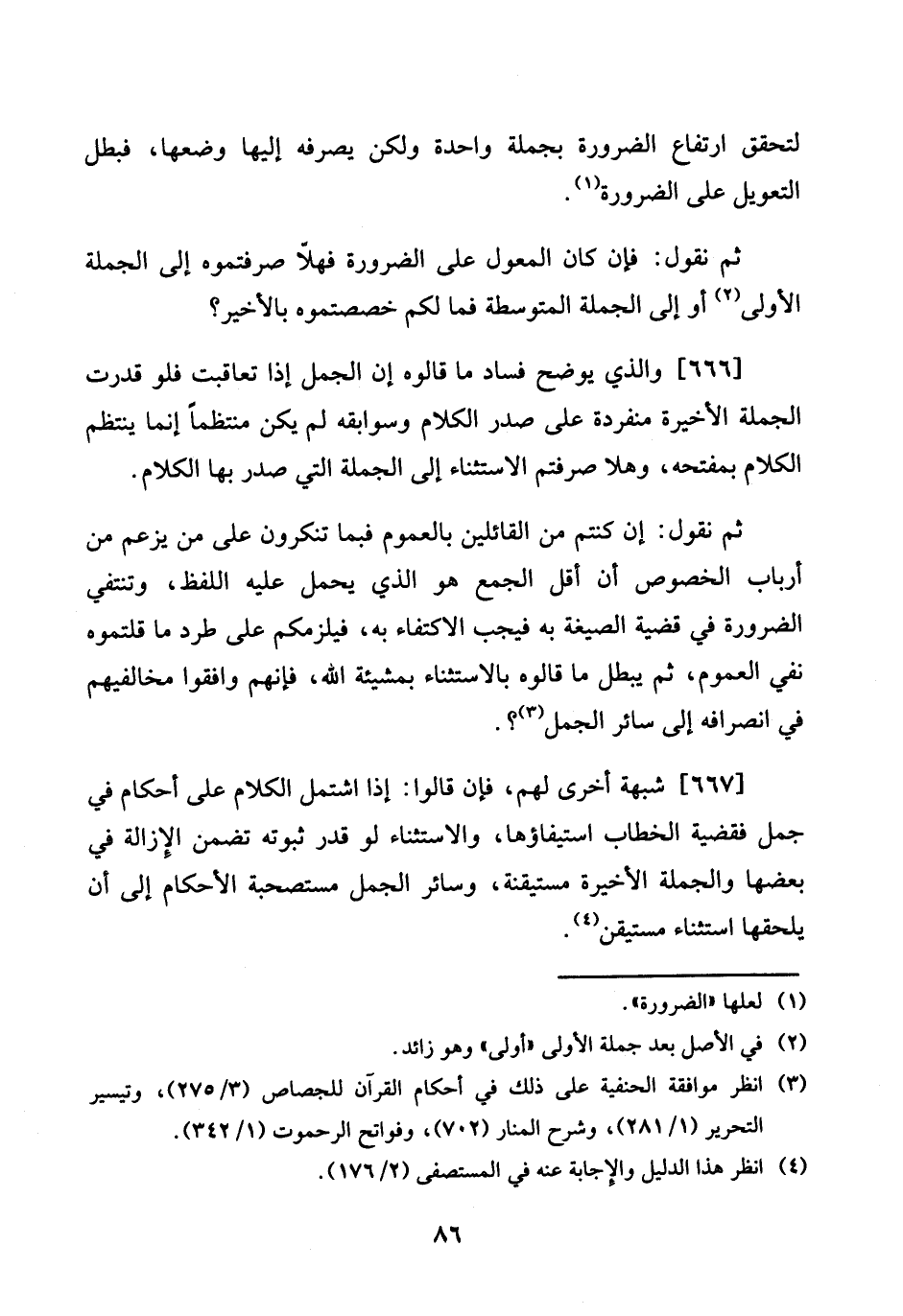 ثمَّ نقُول: فَإِن كَانَ الْمعول على الضَّرُورَة فَهَلا صرفتموه إِلَى الْجُمْلَة الأولى أَو إِلَى الْجُمْلَة المتوسطة فَمَا لكم خصصتموه بالأخير؟