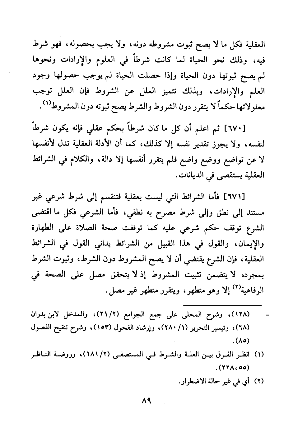 [670] ثمَّ اعْلَم أَن كل مَا كَانَ شرطا بِحكم عَقْلِي فَإِنَّهُ يكون شرطا لنَفسِهِ، وَلَا يجوز تَقْدِير نَفسه إِلَّا كَذَلِك، كَمَا إِن الْأَدِلَّة الْعَقْلِيَّة تدل لأنفسها لَا عَن تواضع وَوضع وَاضع فَلم يَتَقَرَّر أَنْفسهَا إِلَّا دَالَّة، وَالْكَلَام فِي الشَّرَائِط الْعَقْلِيَّة يستقصى فِي الديانَات.
