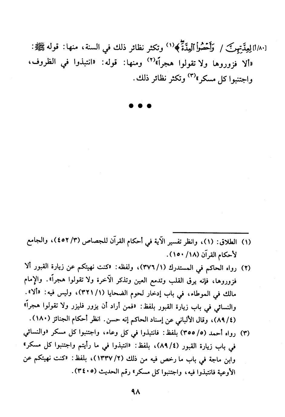 [80 / أ] لعدتهن / وأحصوا وَالْعدة) وتكثر نَظَائِر ذَلِك فِي السّنة، مِنْهَا: قَوْله صلى الله عَلَيْهِ وَسلم: " أَلا فزوروها وَلَا تَقولُوا هجرا " وَمِنْهَا: قَوْله: " انتبذوا فِي الظروف " وَاجْتَنبُوا كل مُسكر " وتكثر نَظَائِر ذَلِك.