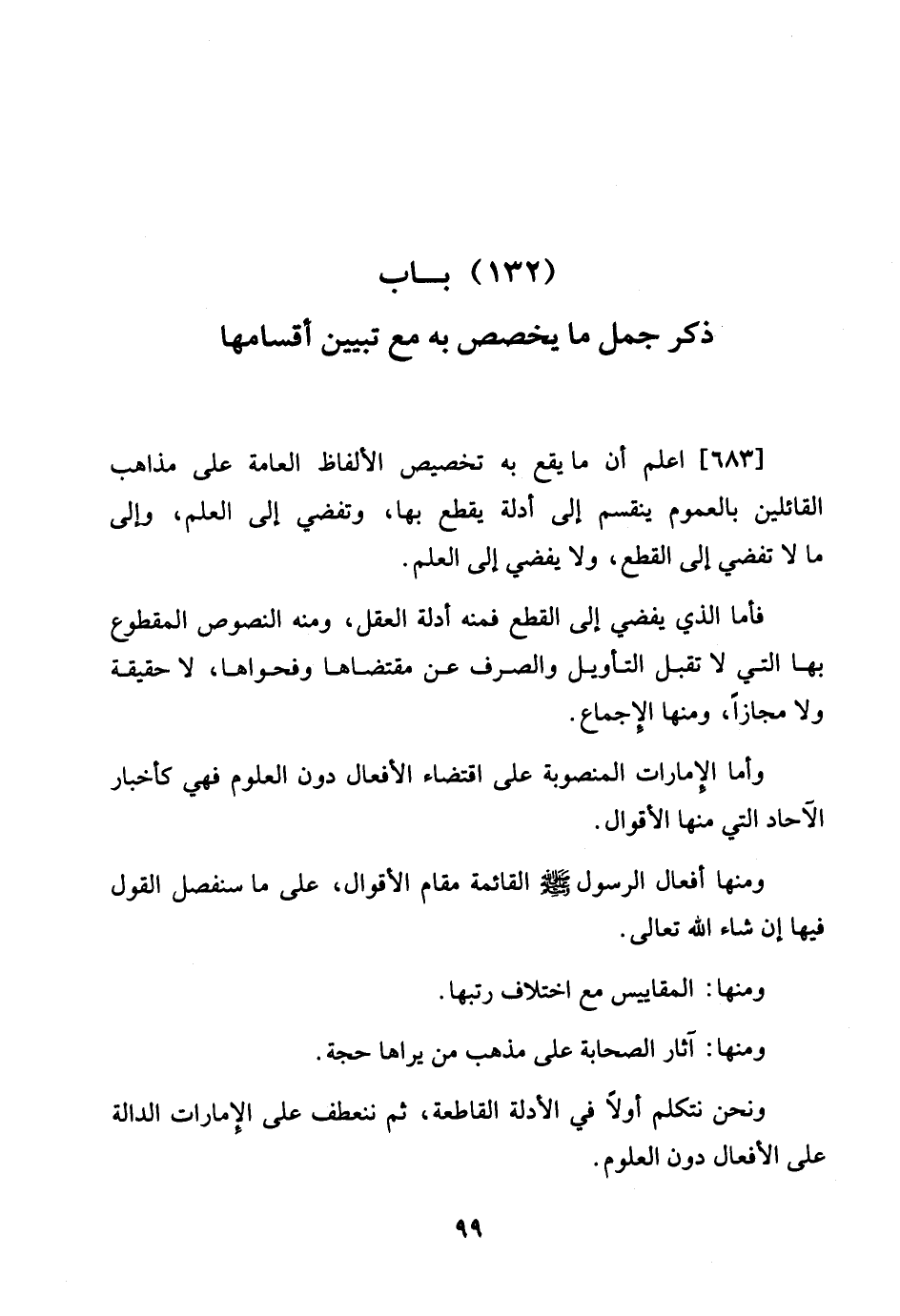 [683] اعْلَم أَن مَا يَقع بِهِ تَخْصِيص الْأَلْفَاظ الْعَامَّة على مَذَاهِب الْقَائِلين بِالْعُمُومِ يَنْقَسِم إِلَى أَدِلَّة يقطع بهَا، وتفضي إِلَى الْعلم، وَإِلَى مَالا تُفْضِي إِلَى الْقطع، وَلَا يُفْضِي إِلَى الْعلم.