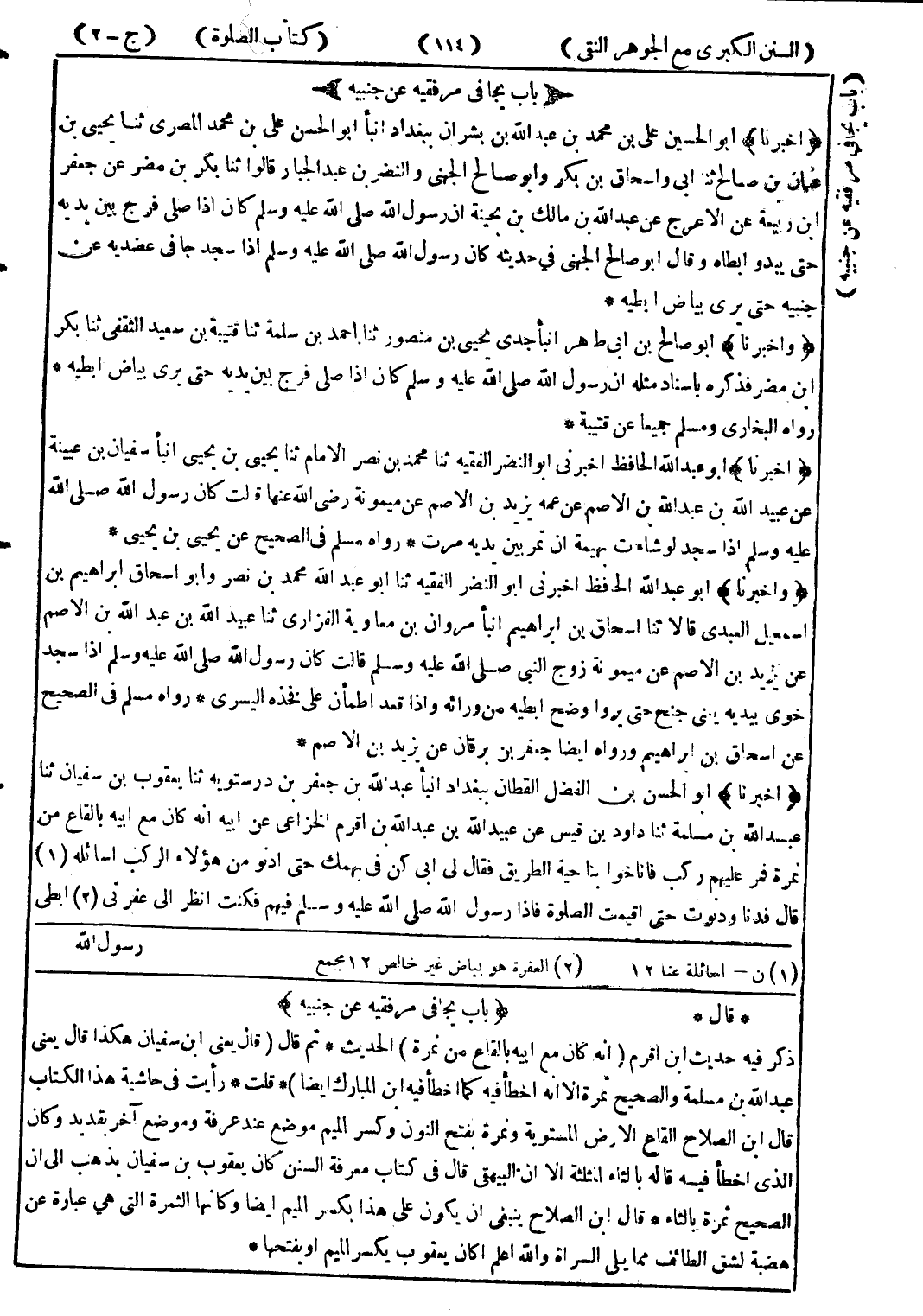 * قال * (باب يجافى مرفقيه عن جنبيه) ذكر فيه حديث ابن اقرم (انه كان مع ابيه بالقاع من نمرة) الحديث * ثم قال (قال يعنى ابن سفيان هكذا قال يعنى عبد الله بن مسلمة والصحيح ثمرة الا انه اخطأ فيه كما اخطأ فيه ابن المبارك ايضا) * قلت * رأيت في حاشية هذا الكتاب قال ابن الصلاح القاع الارض المستوية ونمرة بفتح النون وكسر الميم موضع عند عرفة وموضع آخر بقديد وكان الذى اخطأ فيه قاله بالثاء المثلثة الا ان البيهقى قال في كتاب معرفة السنن كان يعقوب بن سفيان يذهب إلى ان الصحيح ثمرة بالثاء * قال ابن الصلاح ينبغى ان يكون على هذا بكسر الميم ايضا وكانها الثمرة التى هي عبارة عن هضبة لشق الطائف مما يلى السراة والله اعلم اكان يعقوب يكسر الميم أو يفتحها *