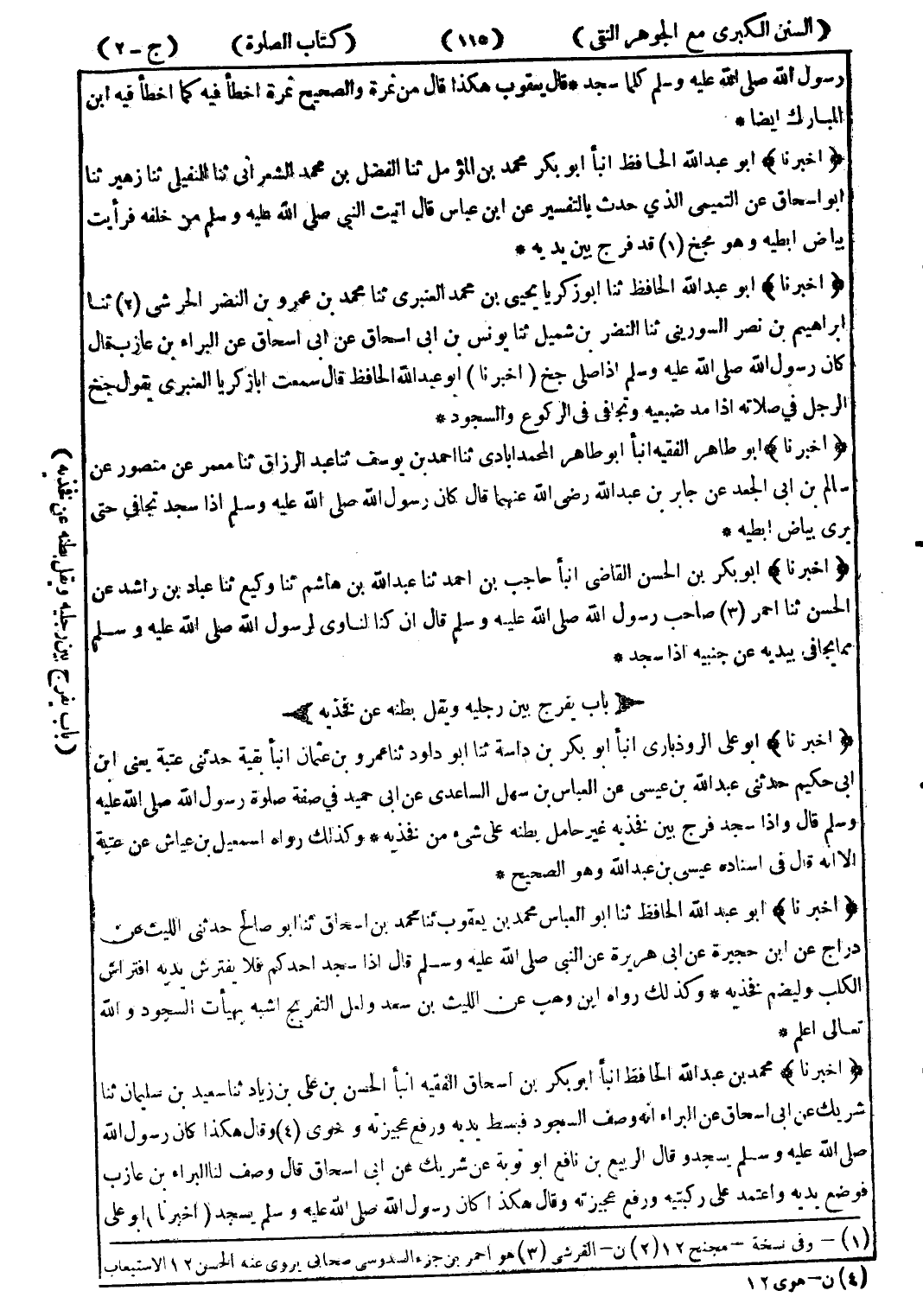 (أخبرنا) محمد بن عبد الله الحافظ انبأ أبو بكر بن اسحاق الفقيه انبأ الحسن بن على بن زياد ثنا سعيد بن سليمان ثنا شريك عن ابى اسحاق عن البراء انه وصف السجود فبسط يديه ورفع عجيزته وحوى (4) وقال هكذا كان رسول الله صلى الله عليه وسلم يسجد وقال الربيع بن نافع أبو توبة عن شريك عن ابى اسحاق قال وصف لنا البراء بن عازب فوضع يديه واعتمد على ركبتيه ورفع عجيزته وقال هكذا كان رسول الله صلى الله عليه وسلم يسجد