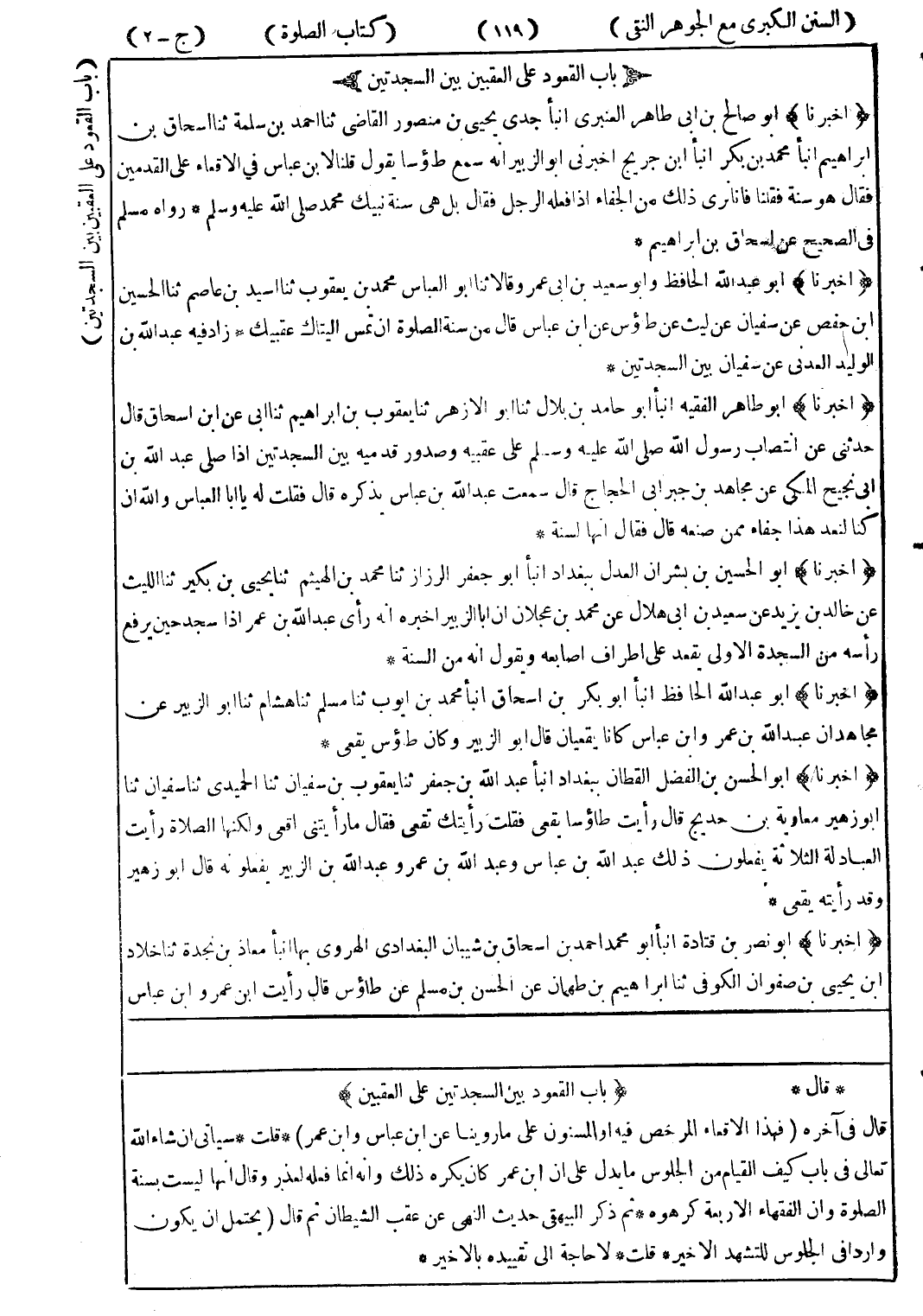 * قال * (باب القعود بين السجدتين على العقبين) قال في آخره (فهذا الاقعاء المرخص فيه أو المسنون على ما روينا عن ابن عباس وابن عمر) * قلت * سيأتي ان شاء الله تعالى في باب كيف القيام من الجلوس ما يدل على ان ابن عمر كان يكره ذلك وانه انما فعله لعذر وقال انها ليست بسنة