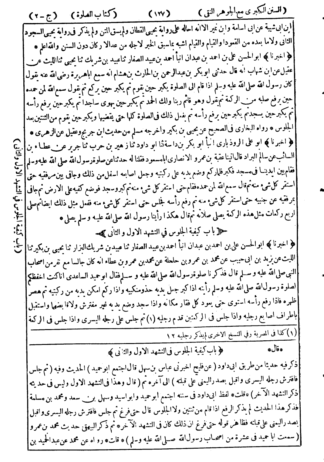* قال * (باب كيفية الجلوس في التشهد الاول والثانى) ذكر فيه حديثا من طريق ابى داود (عن فليح اخبرني عباس بن سهل قال اجتمع أبو حميد) الحديث وفيه (ثم جلس فافترش رجله اليسرى واقبل بصدر اليمنى على قبلته) إلى آخره ثم (قال وهذا في التشهد الاول وليس في حديثه ذكر التشهد الآخر) * قلت * لفظ ابى داود في سننه اجتمع أبو حميد وابو اسيد وسهل بن سعد ومحمد بن مسلمة فذكر هذا الحديث لم يذكر الرفع إذا قام من ثنتين ولا الجلوس قال حتى فرغ ثم جلس فافترش رجله اليسرى واقبل بصدر اليمنى على قبلته فظاهر قوله حتى فرغ ان ذلك كان في التشهد الآخر * ثم ذكر البيهقى حديث محمد ببن عمرو (سمعت ابا حميد في عشرة من اصحاب رسول الله صلى الله عليه وسلم) * قلت * رواه عن محمد عن عبد الحميد بن