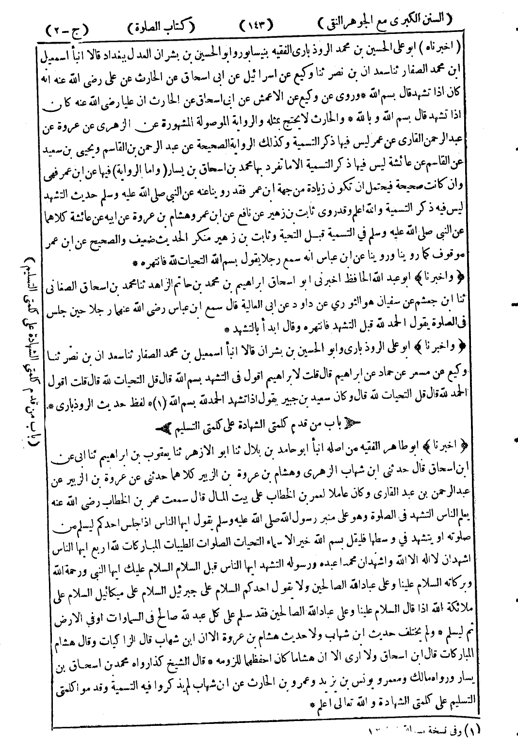 (وأخبرنا) أبو على الروذبارى وابو الحسين بن بشران قالا انبأ اسمعيل بن محمد الصفار ثنا سعد ابن نصر ثنا وكيع عن مسعر عن حماد عن ابراهيم قال قلت لابراهيم اقول في التشهد بسم الله قال قل التحيات لله قال قلت اقول الحمد لله قال قل التحيات لله قال وكان سعيد بن جبير يقول إذا تشهد الحمد لله بسم الله (1) * لفظ حديث الروذبارى *
