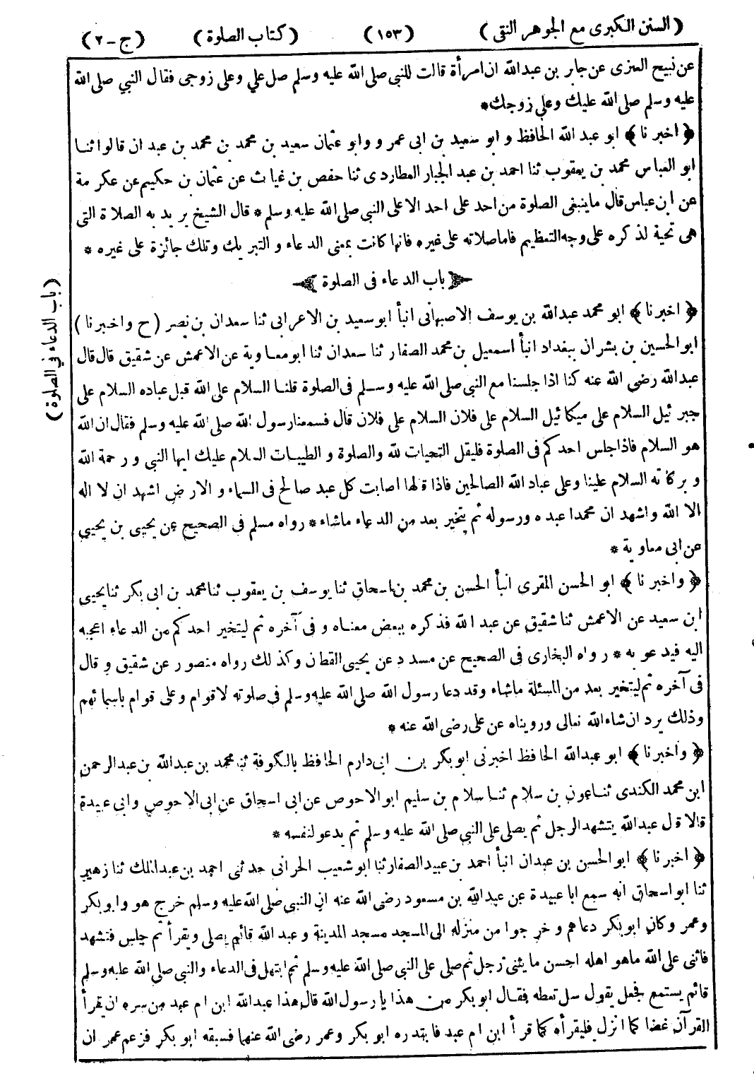(وأخبرنا) أبو عبد الله الحافظ اخبرني أبو بكر بن ابى دارم الحافظ بالكوفة ثنا محمد بن عبد الله بن عبد الرحمن ابن محمد الكندى ثنا عون بن سلام ثنا سلام بن سليم أبو الاحوص عن ابى اسحاق عن ابى الاحوص وابى عبيدة قالا قال عبد الله يتشهد الرجل ثم يصلى على النبي صلى الله عليه وسلم ثم يدعو لنفسه *